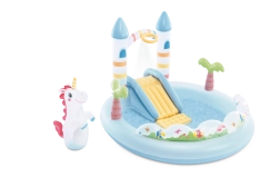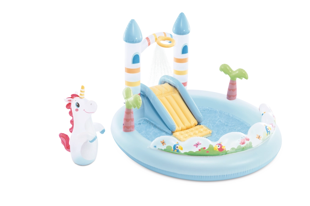 Trasforma il tuo giardino in un luogo da fiaba con il Centro giochi Castello dell’Unicorno – set acquatico gonfiabile per bambini dai 2 anni. Offre una piscinetta bassa, uno scivolo morbido con arrivo imbottito, una doccia d’acqua collegando il tubo da giardino e divertenti accessori tra cui un unicorno gonfiabile e palline colorate per il gioco e lo sviluppo della motricità.