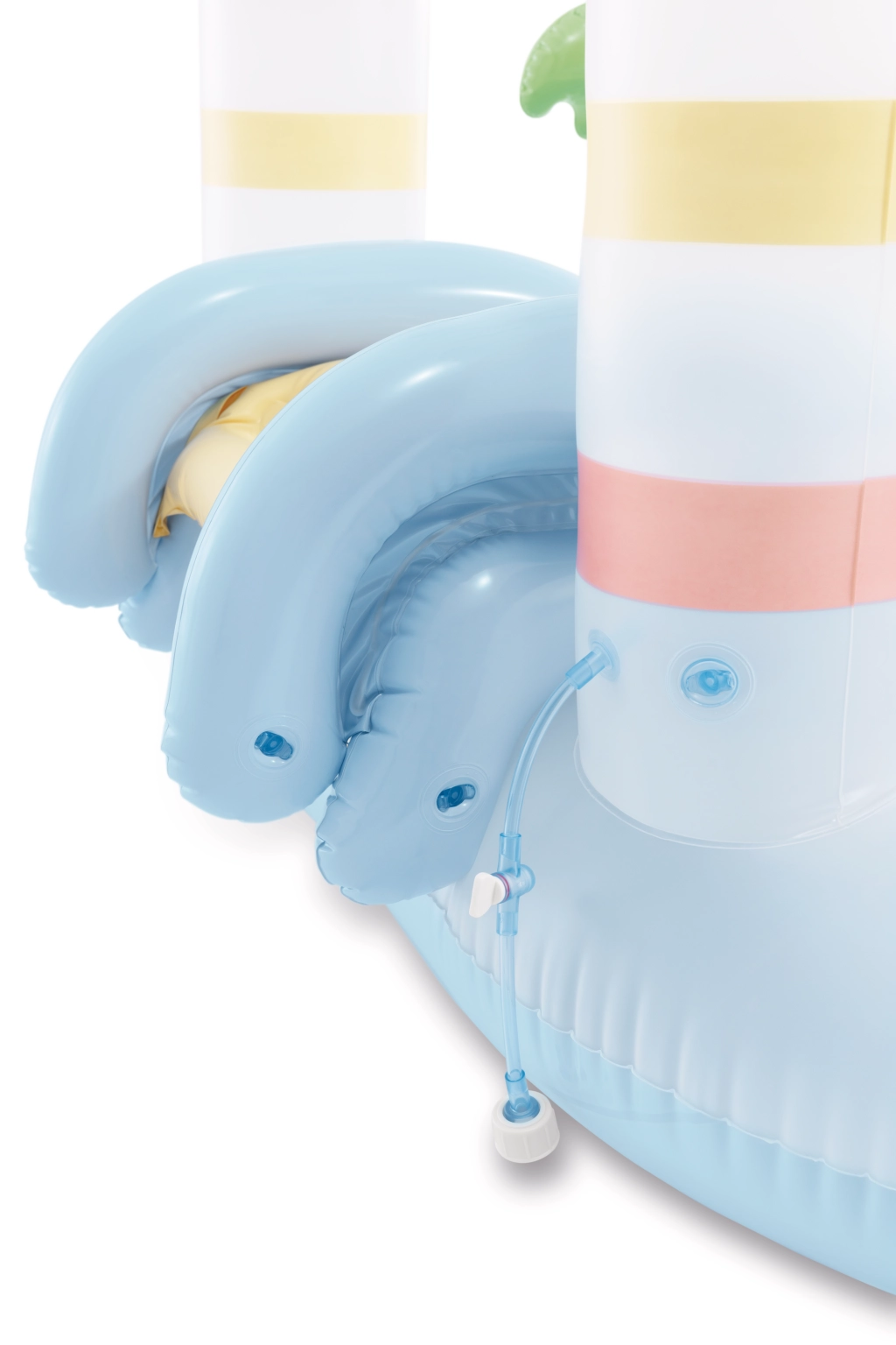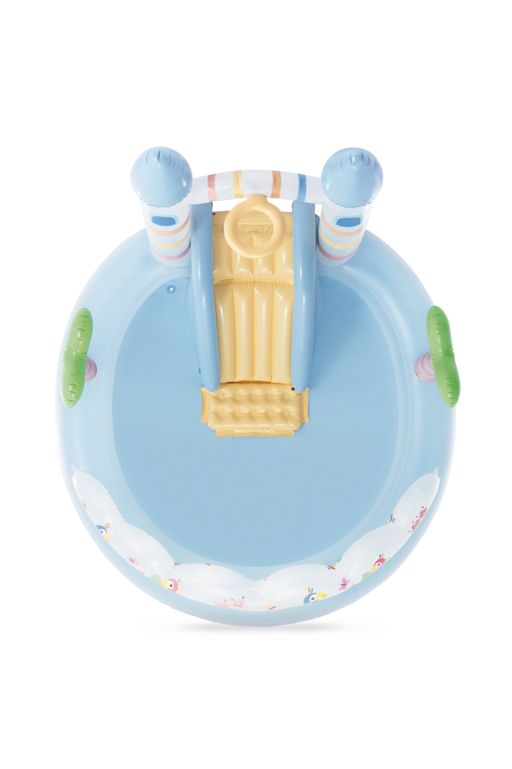 vaschetta azzurro chiaro, scivolo giallo, decorazioni colorate