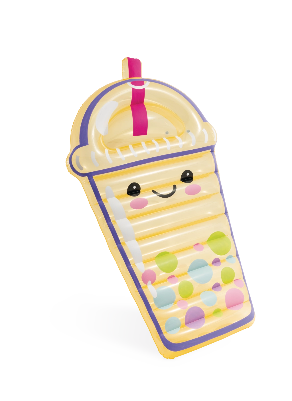 Goditi l’estate con stile con il materassino gonfiabile a forma di bubble tea. Realizzato in PVC di qualità, offre un riposo confortevole sull’acqua, un design giocoso con faccina sorridente e inserti trasparenti. Ideale per piscina e spiaggia: unisce divertimento, comfort e stile originale.