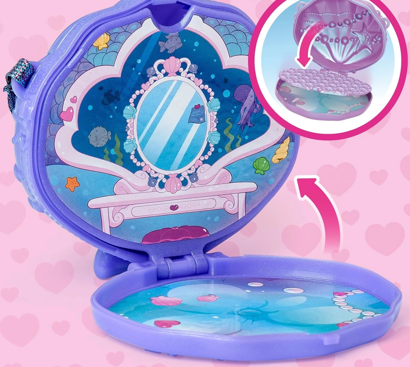 - figurina sirena, coda rimovibile, outfit con scarpe, borsetta a forma di conchiglia, animaletto marino, accessori a tema