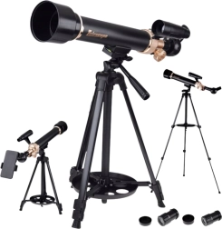 Questo telescopio rifrattore combina una struttura in alluminio resistente con messa a fuoco fluida e regolazione dell’inclinazione per un’osservazione comoda e precisa. Grazie al treppiede regolabile in altezza (fino a 1,35 m) è adatto a giovani appassionati e adulti, sia per l’astronomia notturna sia per l’osservazione diurna di paesaggi e natura.