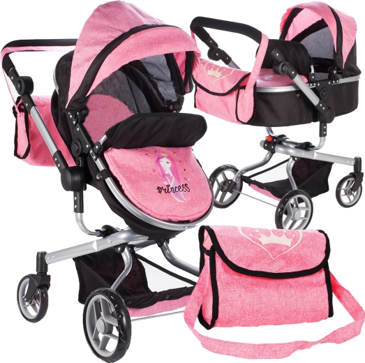 Elegante passeggino 2 in 1 per bambole nella versione rosa‑nera che farà felice ogni piccola mamma. Offre l’uso come passeggino carrozzina e sportivo, ha il manico regolabile e cinture di sicurezza per bambole fino a 55 cm. Inclusa una pratica borsa per piccoli oggetti e un cestello inferiore per trasportare comodamente tutto il necessario.