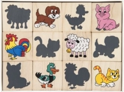 Pexeso con carte di legno con stampa di animali e le loro ombre. Aiuta a sviluppare l'immaginazione e la memoria dei vostri bambini in modo divertente.