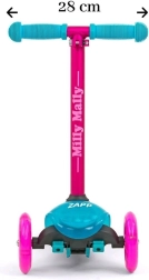 Monopattino per bambini leggero e stabile MILLY MALLY Zapp con tre ruote e manubrio regolabile in altezza (61/66 cm), ideale per bambini dai 3 anni. Offre facile controllo tramite inclinazione del corpo, ruote anteriori luminose per ancora più divertimento e freno posteriore con parafango per una guida sicura. Il carico massimo è di 50 kg.