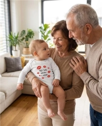Comodo body per bambini a manica lunga del marchio NEW BABY in 100% cotone, piacevole sulla pelle delicata e con la simpatica stampa “Sono stati qui la nonna e il nonno”. Grazie alla pratica chiusura a bottoncini a pressione sulla spalla e tra le gambine, il cambio e la vestizione sono rapidi e semplici. I colori della stampa sono certificati e sicuri per i neonati.