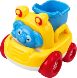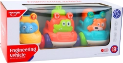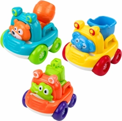 Il set include tre diversi camioncini da costruzione: escavatore, betoniera e autocarro ribaltabile – ciascuno con un simpatico animaletto (coccodrillo, orsacchiotto, elefantino). Le forme robuste e arrotondate senza spigoli assicurano una presa sicura per le piccole mani, mentre le ruote scorrevoli invogliano a farli correre senza sosta.
