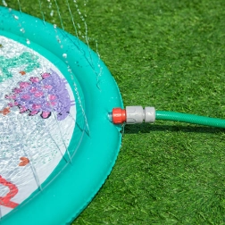Collegando il tubo da giardino, l’acqua spruzza dai fori lungo il bordo creando una rinfrescante fontana. L’altezza dei getti si regola facilmente con la pressione dell’acqua.