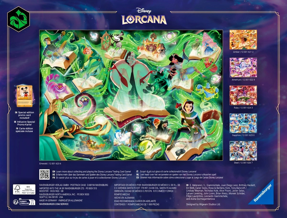 Scopri un'illustrazione dettagliata dal mondo di DISNEY LORCANA nell'edizione Glimmers of the Realm: Smeraldo. Il puzzle RAVENSBURGER vanta stampa di altissimo livello e precisione di fustellatura, grazie alle quali i pezzi combaciano perfettamente e il puzzle mantiene la forma. L'immagine finale di circa 70 × 50 cm è ideale per essere incorniciata.