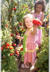 La pratica tasca frontale con motivo a coccinella contiene piccoli attrezzi, semi e oggetti vari.