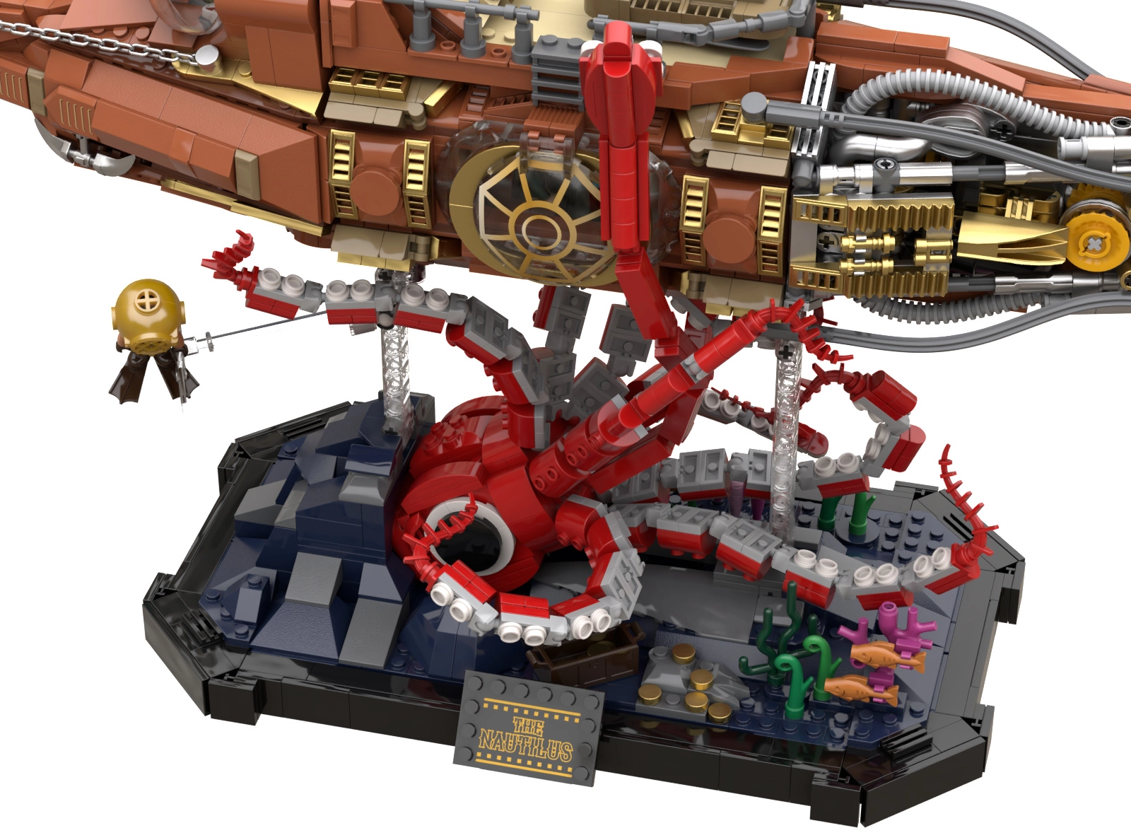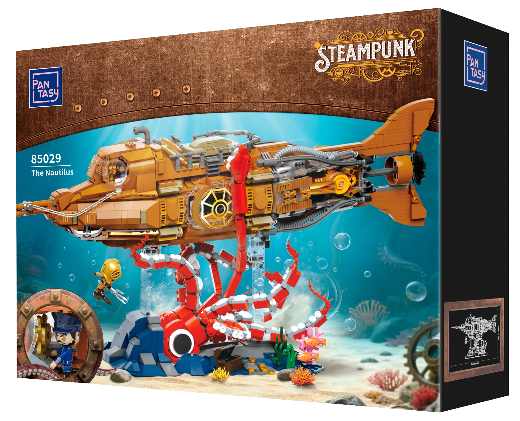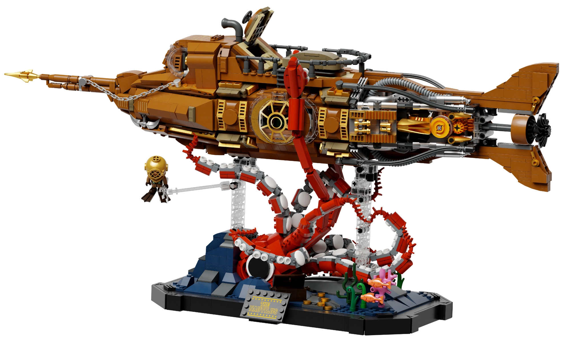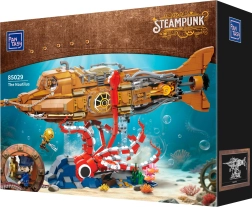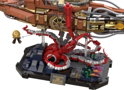 Questo modello da collezione combina costruzione precisa ed estetica steampunk decisa. Lo scafo modulare in tre sezioni permette di sbirciare nel cockpit, nel salone e nella sala macchine, mentre l'elica mobile con ingranaggi dona al modello una meccanica credibile. La scena sul basamento con coralli e piovra in attacco crea un dinamico spettacolo sottomarino ideale per l'esposizione.