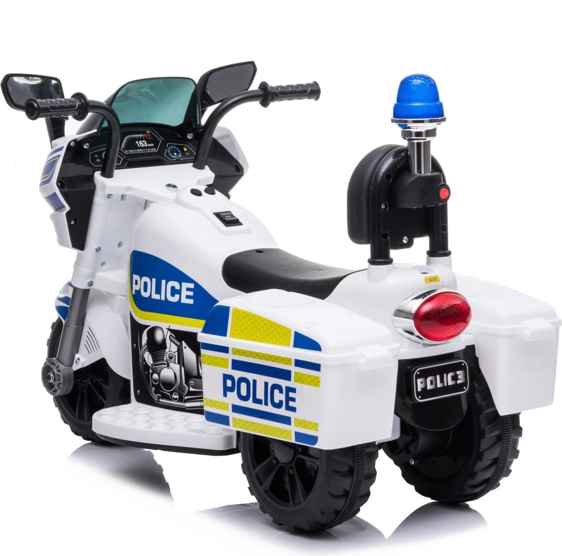 La stilosa moto della polizia elettrica per bambini in bianco e blu offre azione di polizia realistica con luci lampeggianti, suono di sirena e comandi avanti/indietro facili. La struttura a tre ruote, il sedile ergonomico con schienale e la velocità fino a 3 km/h garantiscono divertimento sicuro in casa e all’aperto. Ingresso MP3 integrato, clacson e pulsanti musicali favoriscono il gioco di ruolo e lo sviluppo della coordinazione.