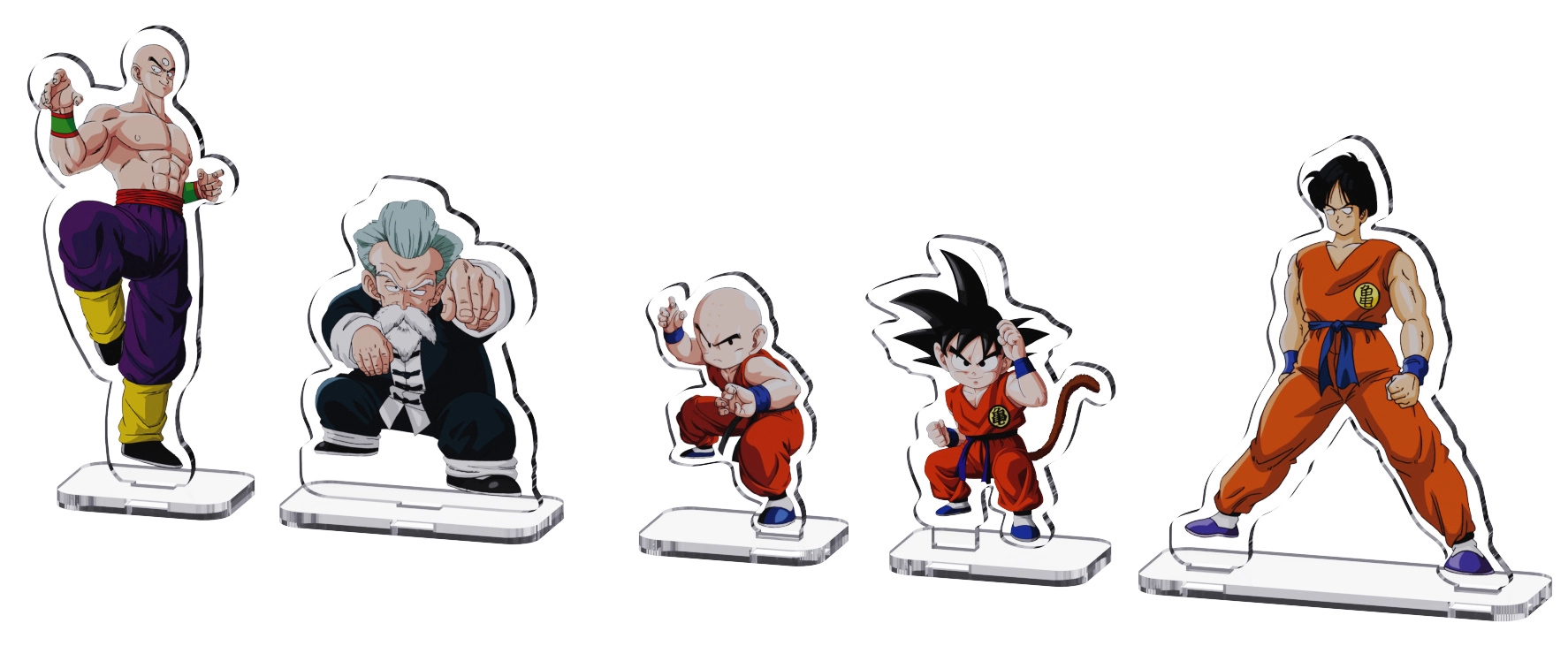 - 5 figurine in acrilico: Goku, Jackie Chun, Yamcha, Krillin, Tenshinhan per composizioni dinamiche.