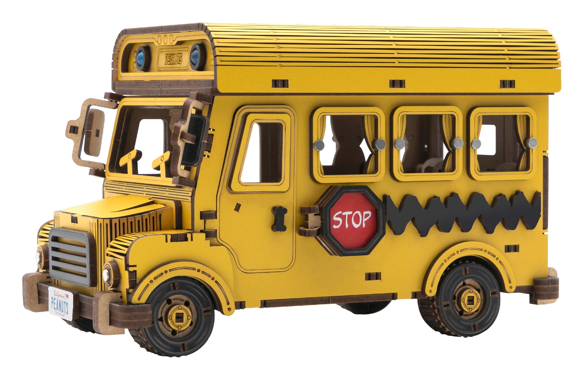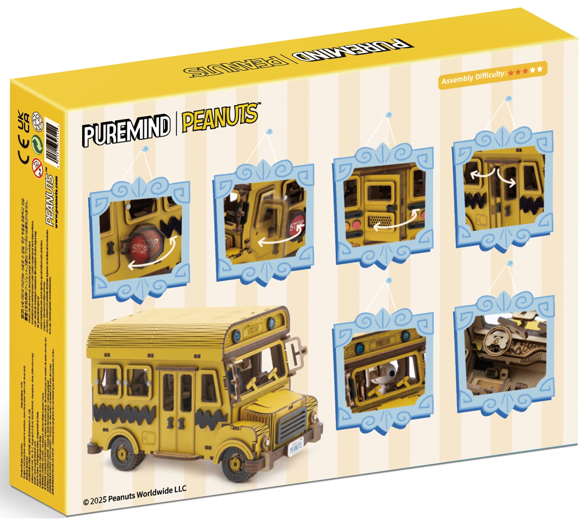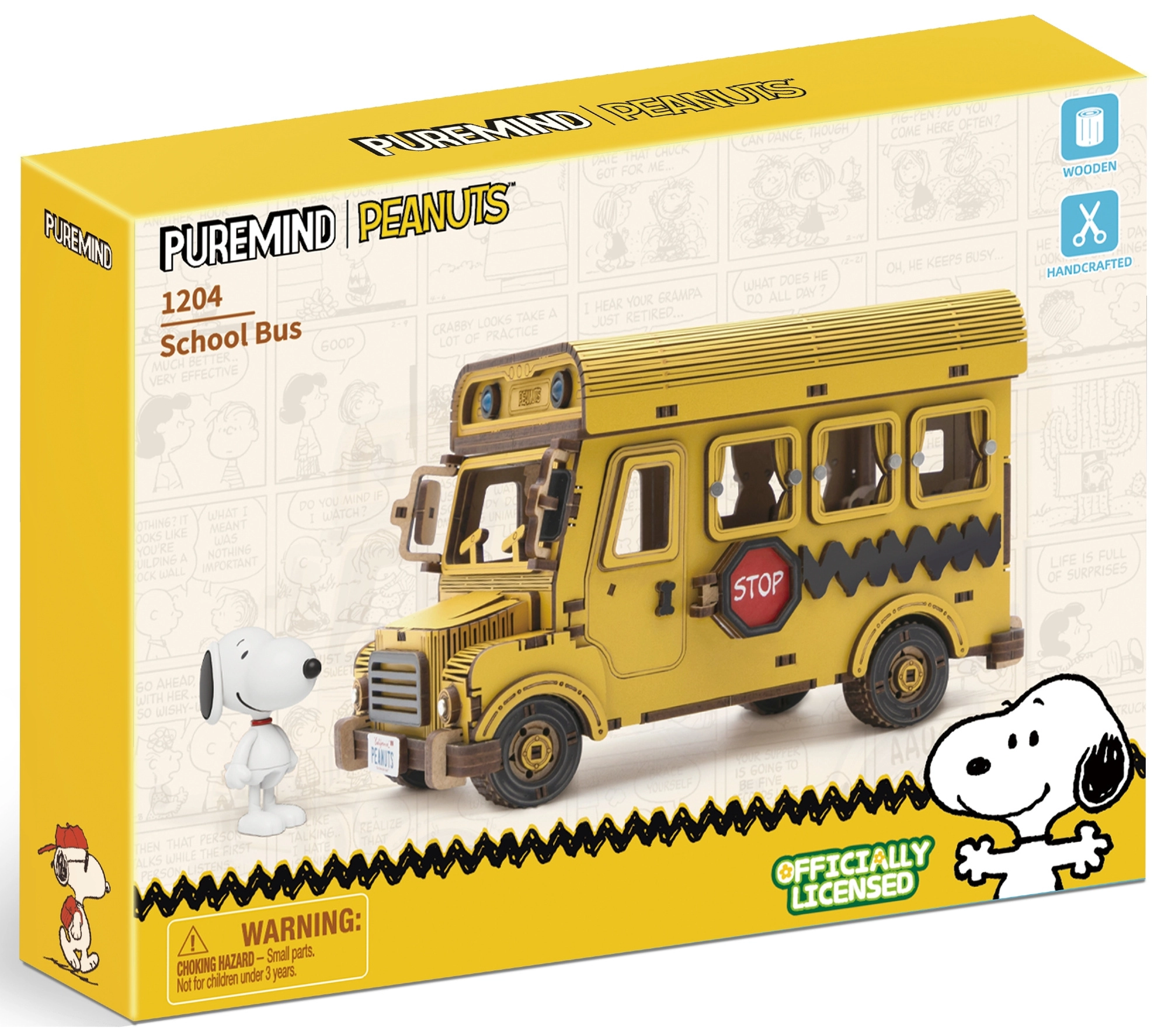 Questo modello in legno da collezione del marchio Puremind porta a casa tua la magia del mondo PEANUTS. Assembla il classico scuolabus americano con ricchi dettagli di carrozzeria, elementi apribili e interni realistici. Il kit conquisterà i fan di Snoopy, gli appassionati di modellismo e i bambini creativi.