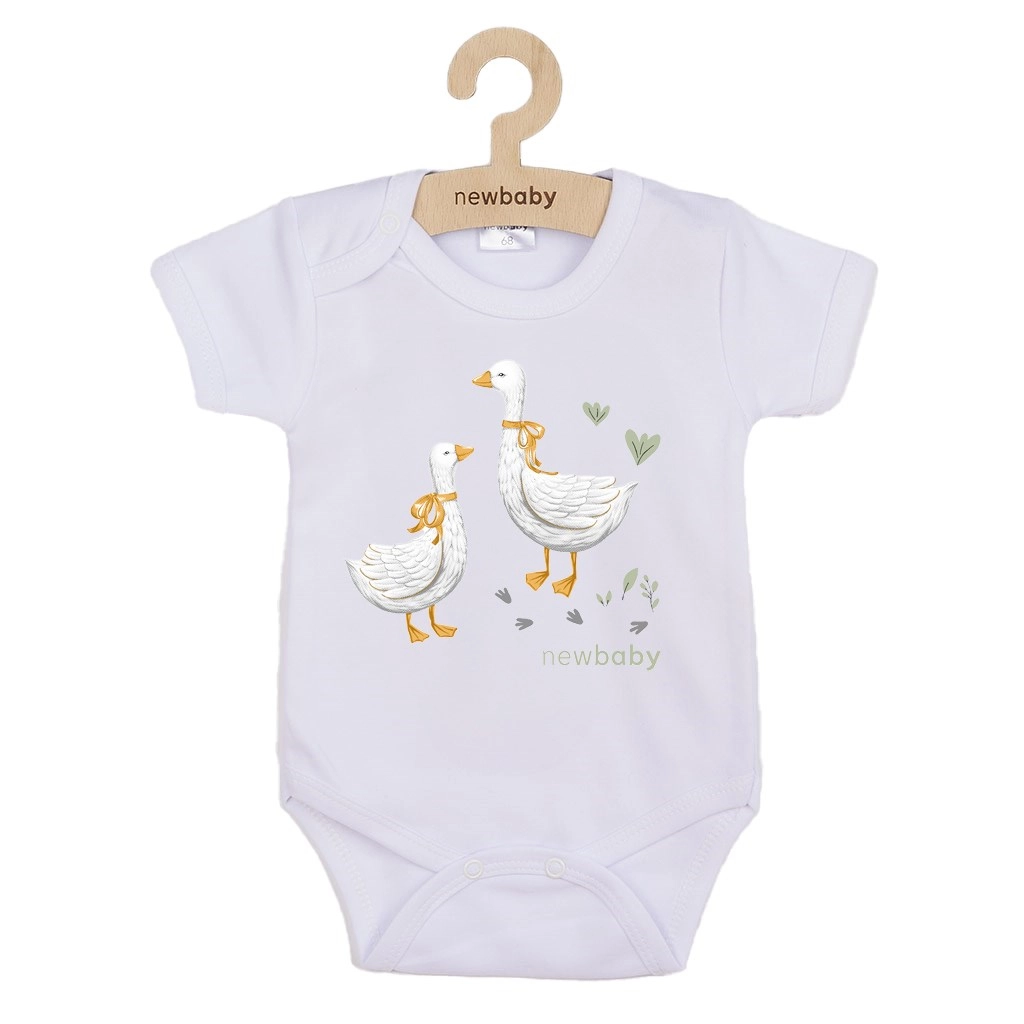 Dolce body per bambini in 100% cotone con motivo di ochette NEW BABY, piacevole e confortevole per ogni giorno. Dispone di pratica chiusura a bottoncini a pressione sulle spalle e tra le gambine per facilitare il cambio, è traspirante e delicato sulla pelle sensibile. I colori della stampa sono certificati e il materiale rispetta lo OEKO-TEX STANDARD 100.