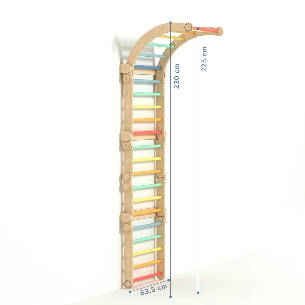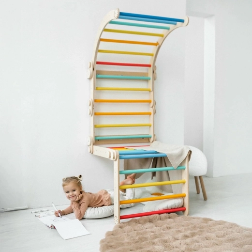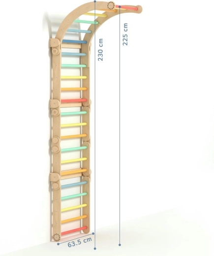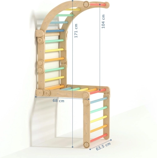 La barra e i pioli arcobaleno invogliano a pendersi e arrampicarsi, mentre i bordi lisci e il telaio stabile garantiscono sicurezza in ogni attività.