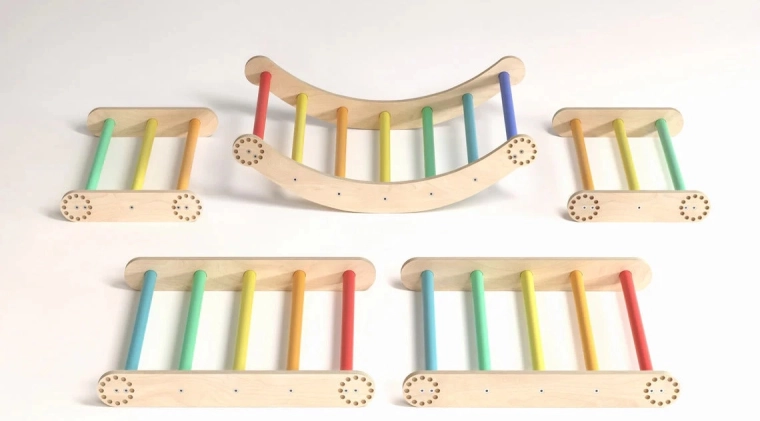Due triangoli e un arco di equilibrio si trasformano facilmente da percorso a pavimento a parete da arrampicata con fissaggio a muro. Ideale per sviluppare motricità ed equilibrio.