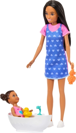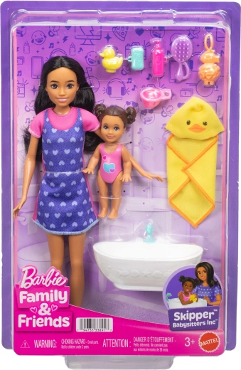 Il set BARBIE Skipper Bagnetto del bebè offre un gioco autentico di cura dei più piccoli. La sorella maggiore Skipper indossa un abito con grembiule blu con cuoricini e comode sneakers, mentre il bebè si gode il bagno nella vaschetta con adorabili accessori. I bambini possono ricreare più e più volte rituali del bagnetto con la paperella, il telo con cappuccio e la “cosmetica”.