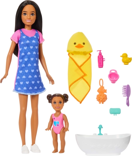 - Bambola Skipper con abito e sneakers, bambolotto, vaschetta, asciugamano con cappuccio, paperella, “shampoo”, ciotolina, “sapone”, spugnetta/guanto, spazzola