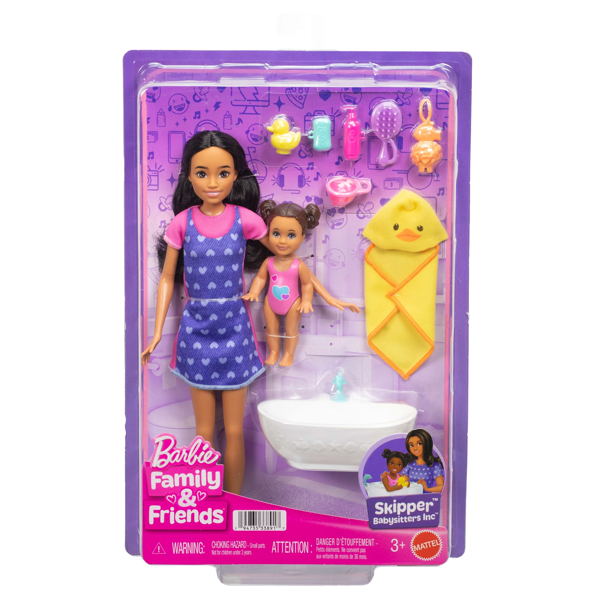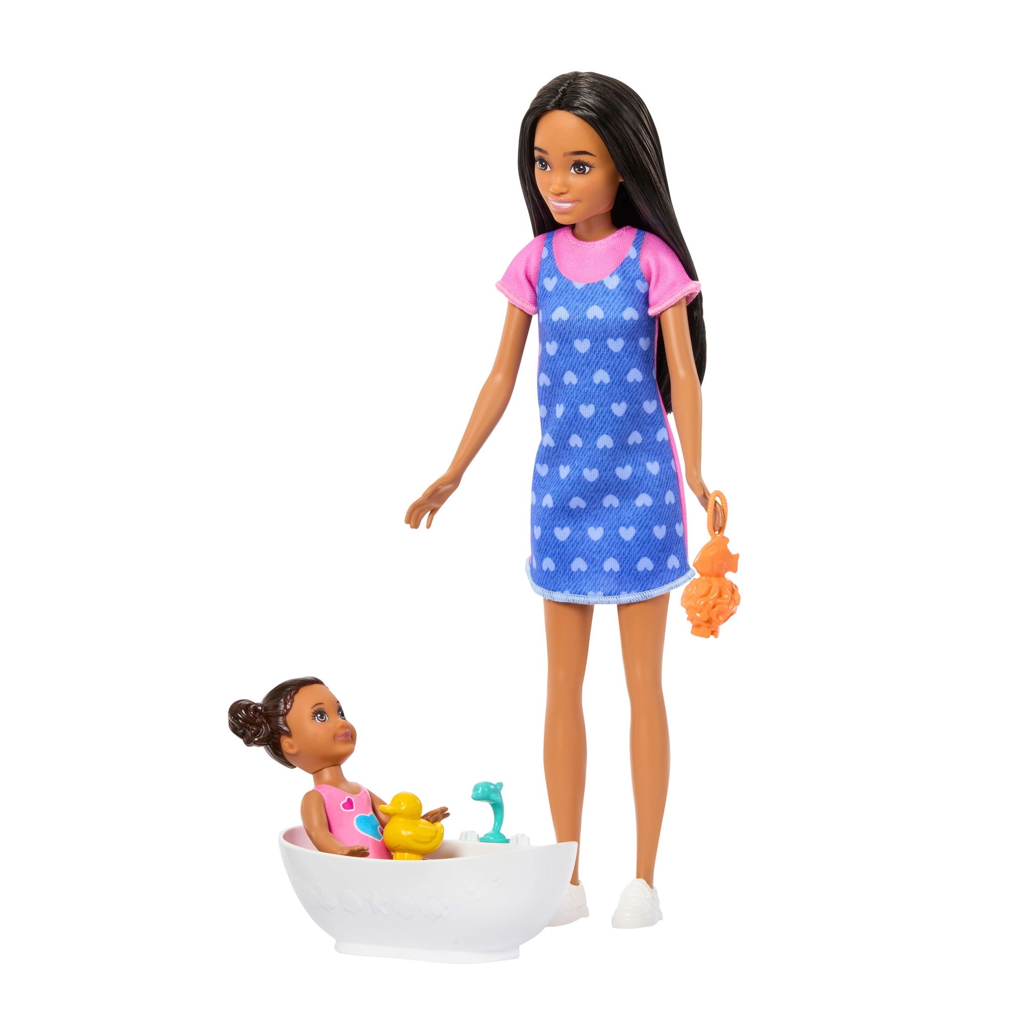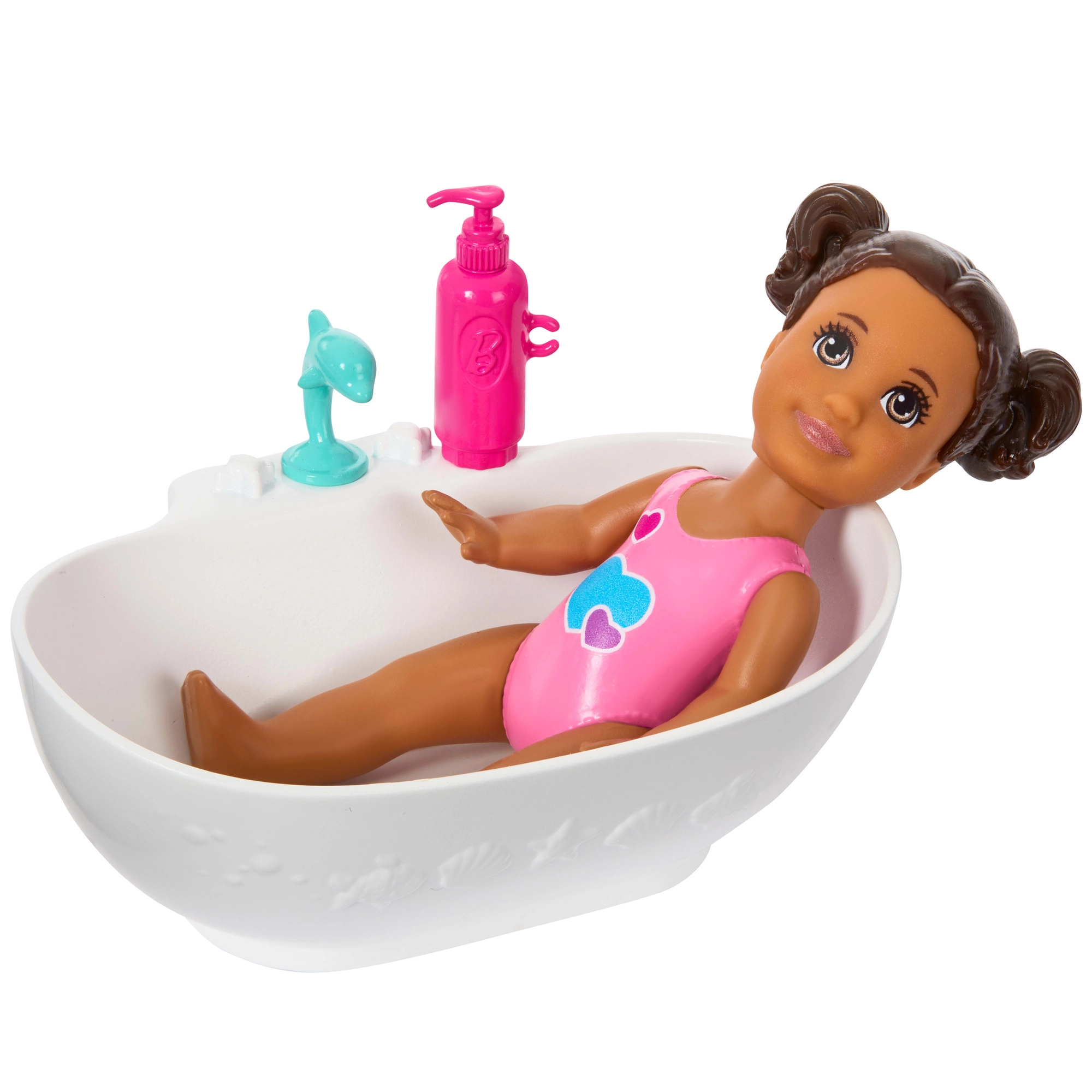 Scopri il tenero set per il bagnetto – BARBIE Skipper babysitter con bebè, vaschetta e tanti accessori. I bambini adoreranno la routine del bagnetto realistica con la paperella, il telo con cappuccio, lo “shampoo”, la spazzola e altri accessori. Una scelta perfetta per sviluppare fantasia, empatia e abilità sociali nei bambini dai 3 anni in su.