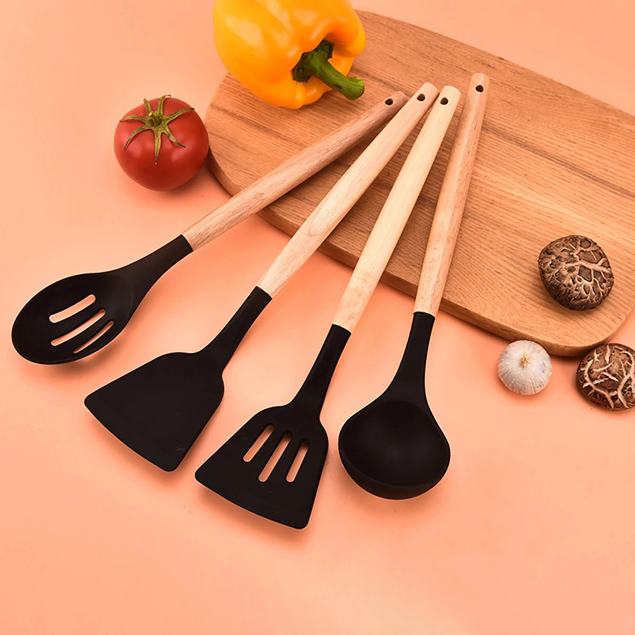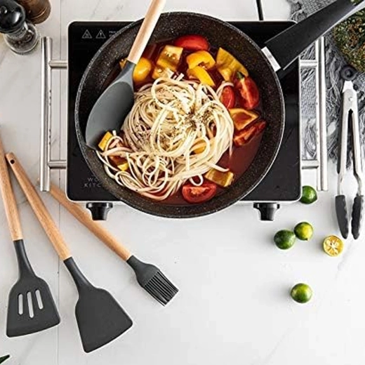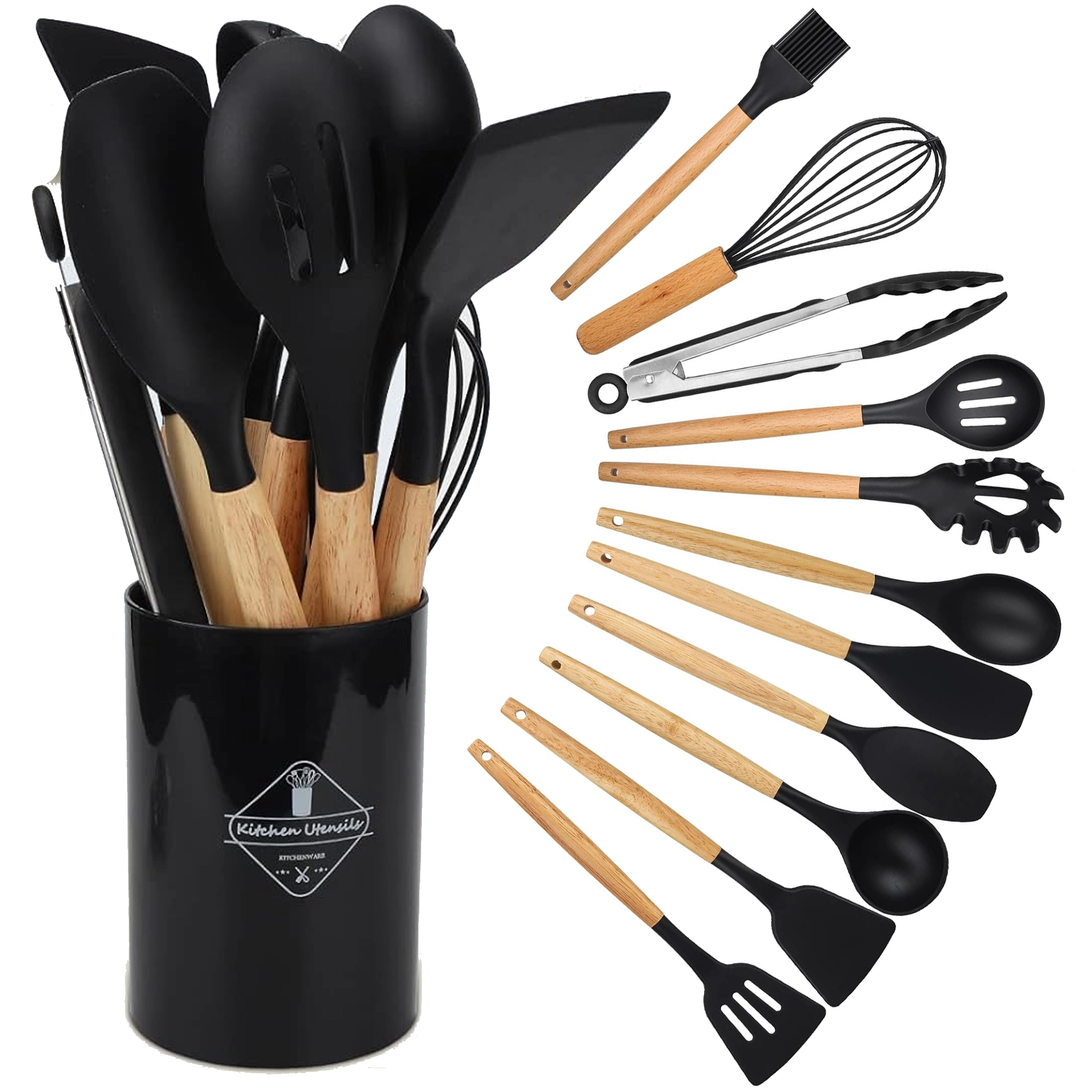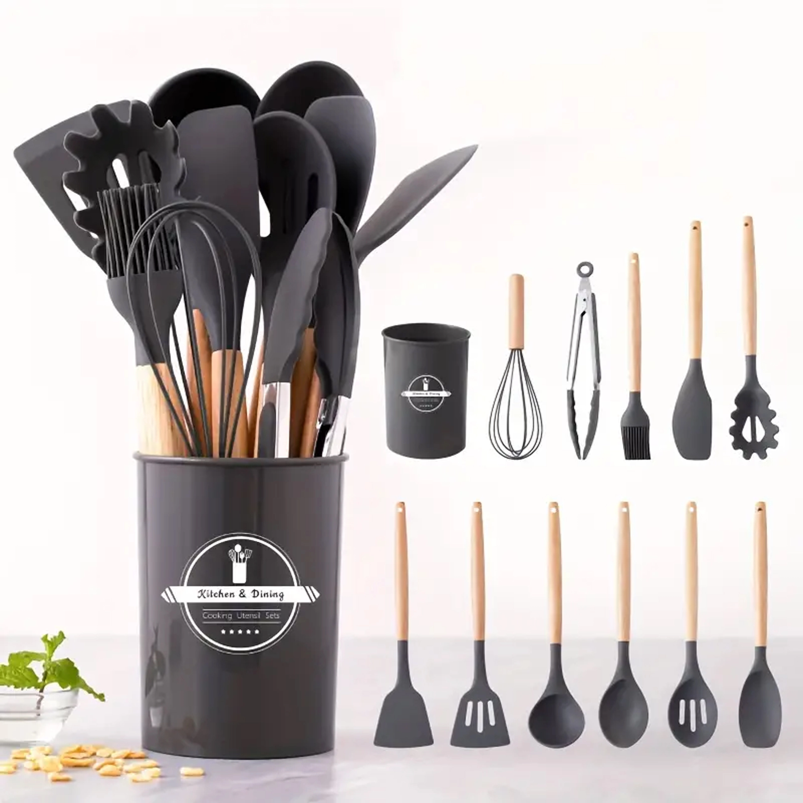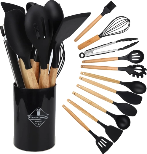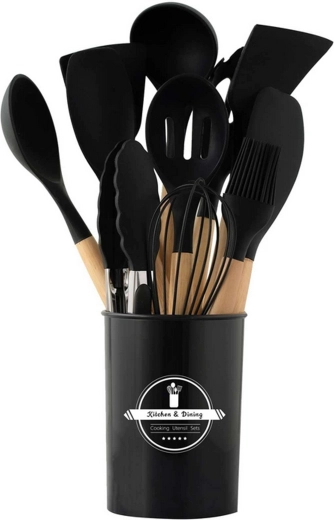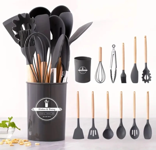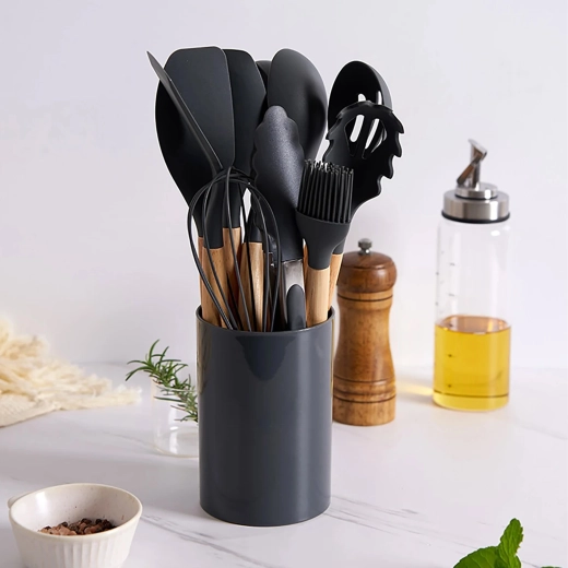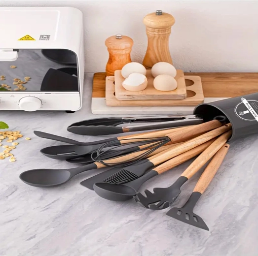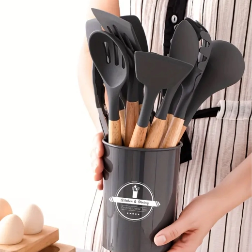 Pratico set di 12 utensili in silicone con manici in legno per l'uso quotidiano in cucina. Delicati sulle pentole antiaderenti, resistenti al calore, non graffiano le superfici e offrono comode impugnature ergonomiche in legno. Ideali per mescolare, girare, servire e cuocere al forno – tutto riposto ordinatamente nello stand.
