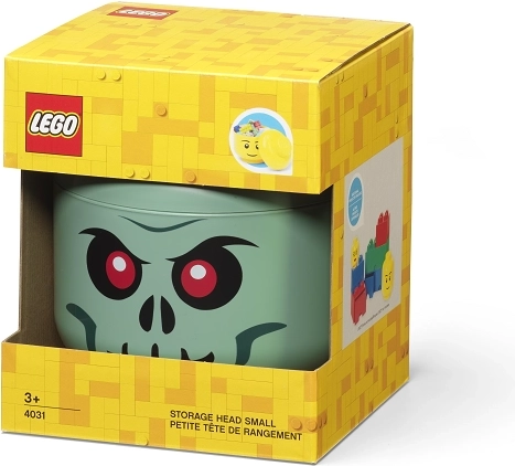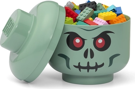 Questa testa contenitore LEGO verde (taglia S) è ideale per riporre mattoncini LEGO, piccoli giocattoli o dolci. Grazie alla stampa evidente della faccia da scheletro diventa una decorazione giocosa per la cameretta e un pratico organizer.