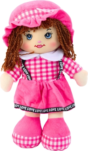 Il vestito con delicato motivo a quadretti, il cappellino coordinato e le scarpette morbide donano alla bambola un aspetto grazioso.
