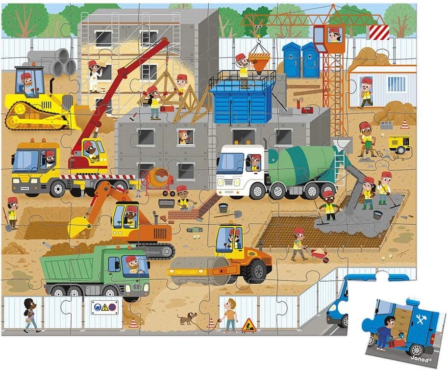 Elegante puzzle in cartone JANOD con tema cantiere, perfetto per piccoli costruttori e amanti delle macchine. Confezionato in una robusta valigetta con manico, è ideale sia per i viaggi sia per riporlo a casa. Include un poster-guida che aiuta i bambini nell’orientamento durante la composizione.