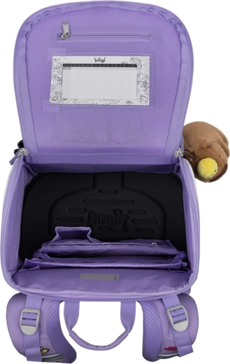 L’interno ben studiato con apertura a ribalta consente un accesso comodo ai libri direttamente dal banco; l’elastico interno di fissaggio mantiene i quaderni più pesanti vicino alla schiena. Le tasche laterali in materiale robusto sono adatte alla borraccia; le cerniere YKK di alta qualità garantiscono lunga durata e scorrimento fluido. Le spille intercambiabili aggiungono un tocco di stile personale al piccolo scolaro.