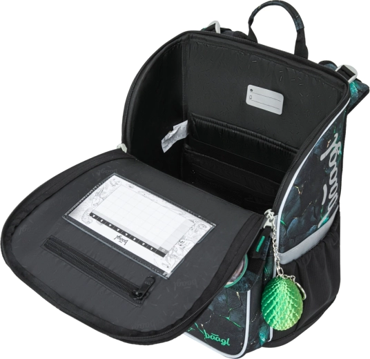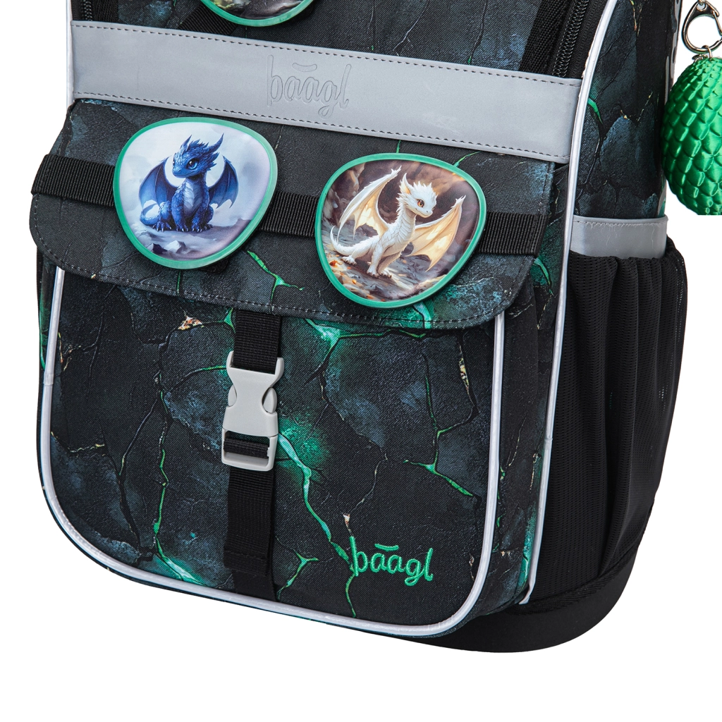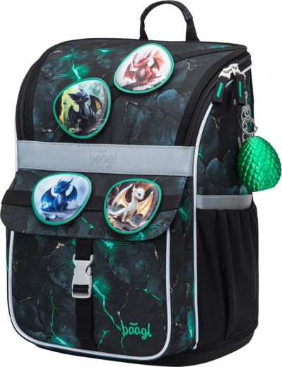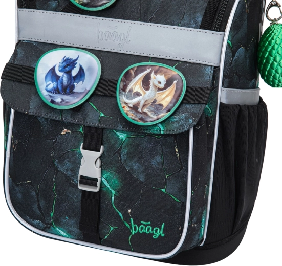 Elementi riflettenti per una migliore visibilità, materiale idrorepellente e affidabili cerniere YKK. Distintivi intercambiabili e il motivo con draghi conferiscono alla cartella un look personale.
