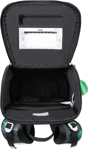 L’interno è organizzato in modo pratico, con elastico per fissare libri e quaderni più vicino al baricentro del corpo. Il coperchio a ribalta permette un facile accesso al materiale direttamente dal banco, mentre le tasche laterali in materiale robusto possono contenere anche una borraccia. Presenti elementi riflettenti di sicurezza per una buona visibilità, affidabili cerniere YKK e il fondo rigido, grazie al quale la cartella rimane in piedi da sola.