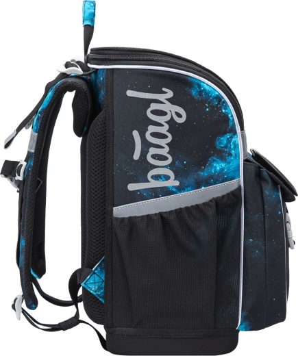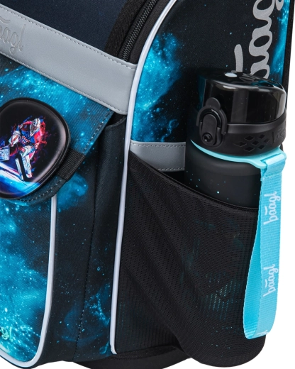 Il sistema di apertura a ribalta, l’ampio scomparto principale con organizer, l’elastico per fissare il contenuto e le tasche laterali per la borraccia garantiscono ordine e stabilità del materiale scolastico.