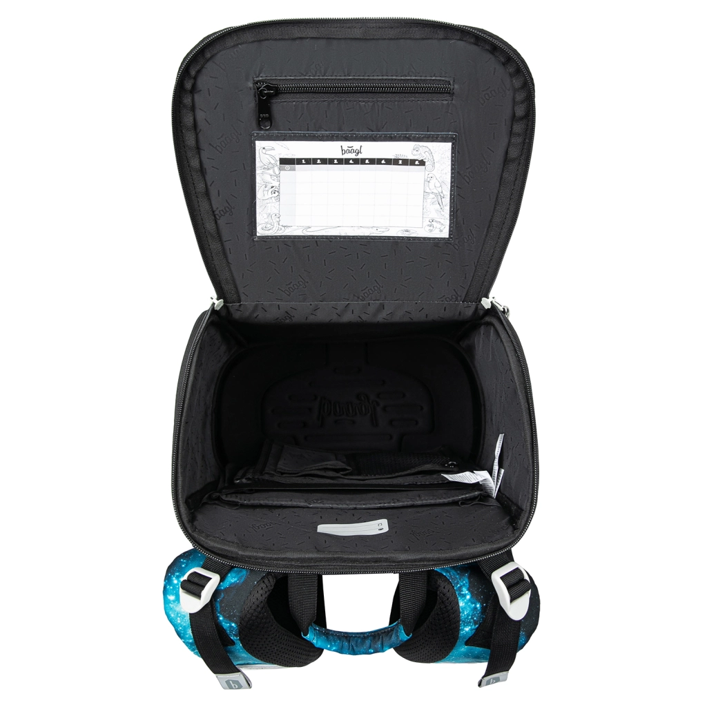 Chiusura a ribalta per riporre comodamente dal banco, ampia camera principale con tasca interna, tasca in rete nel coperchio, elastico per fissare i libri di testo e tasche laterali per la bottiglia.