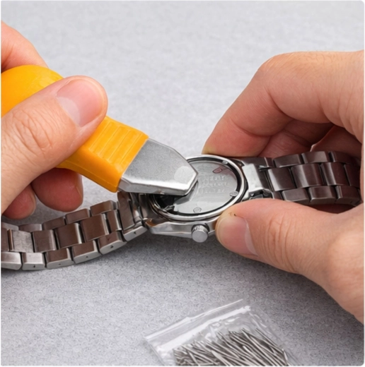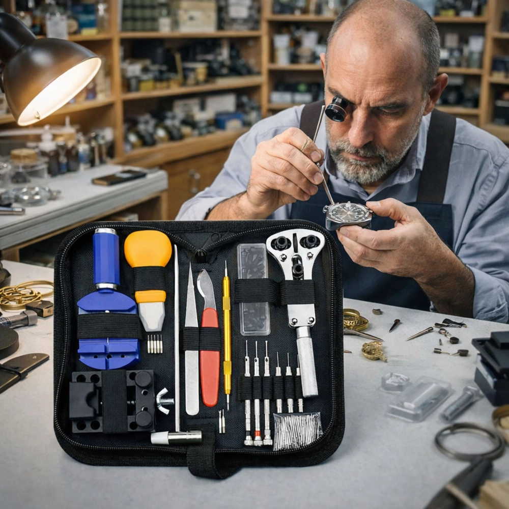Set esteso di utensili per aprire i fondelli, accorciare i bracciali, sostituire le anse a molla e maneggiare con precisione i componenti. La pratica custodia mantiene tutto ordinato e ben organizzato.