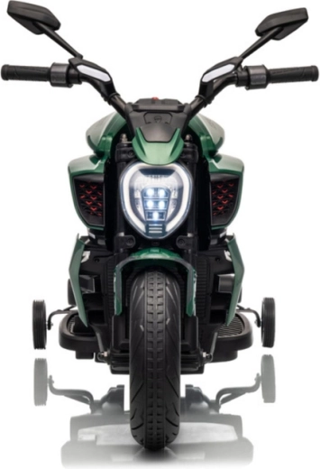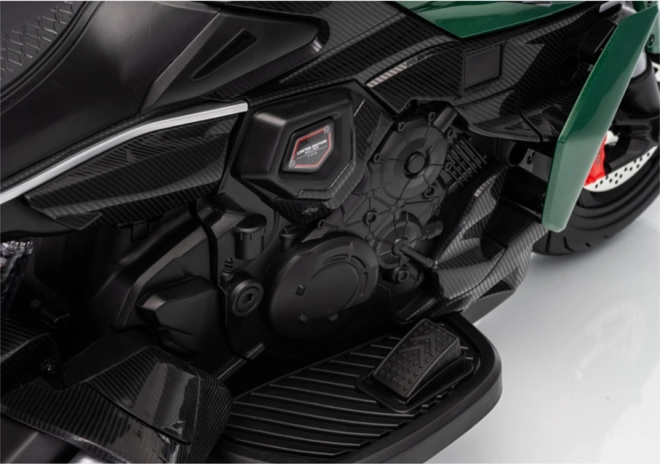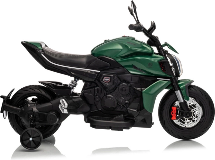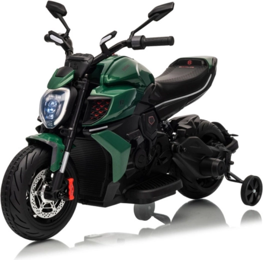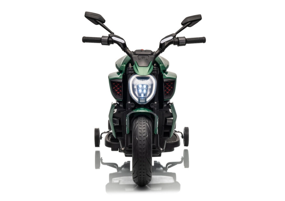 La moto elettrica per bambini in colore verde colpisce per il look sportivo e la struttura sicura. Grazie ai pneumatici larghi e alle rotelle stabilizzatrici laterali, i bambini acquistano rapidamente sicurezza, mentre il luminoso faro a LED e i dettagli realistici (specchietti retrovisori, freni a disco di aspetto realistico) amplificano la vera esperienza da motociclista.
