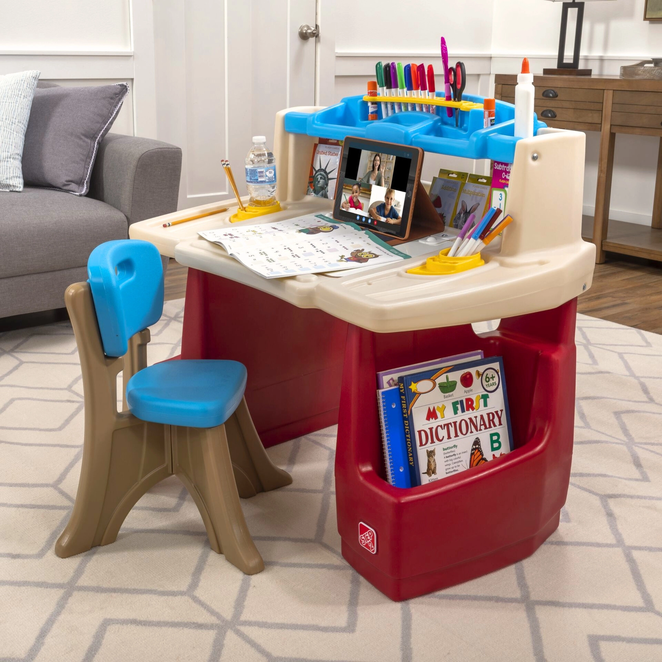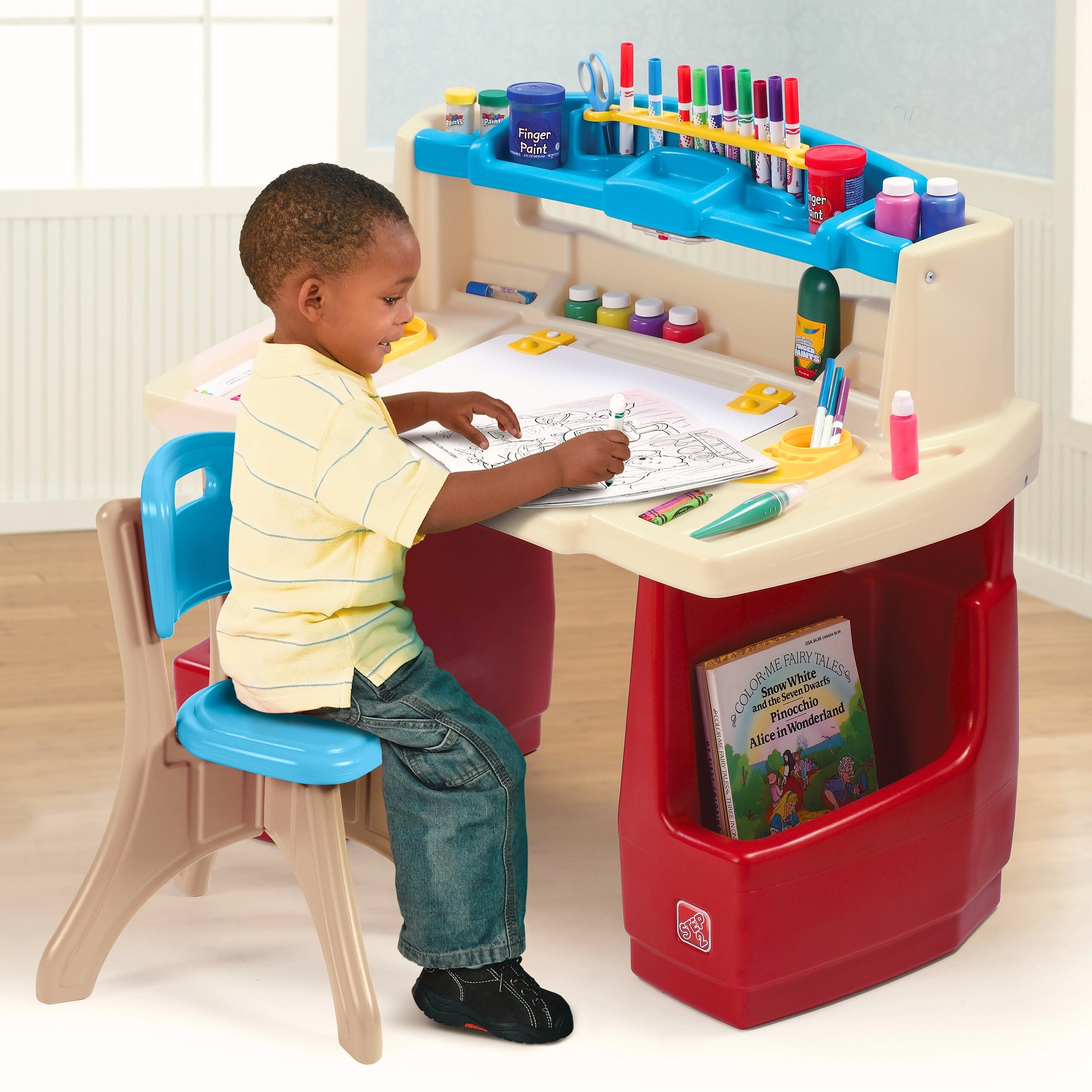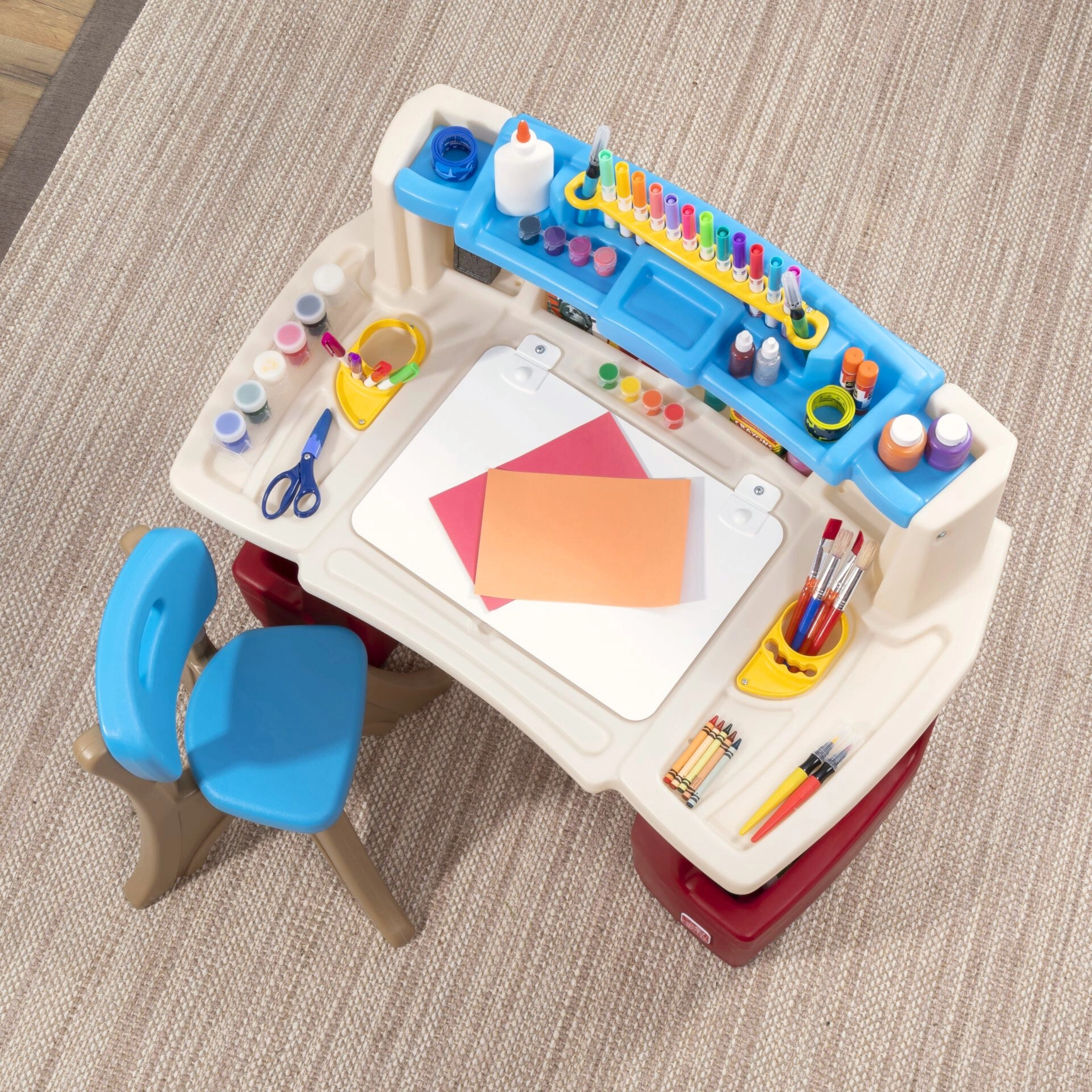 Il set STEP2 Deluxe Art Master trasforma la cameretta in un atelier ispirante. I bambini hanno a disposizione un’ampia area di lavoro con lavagna cancellabile a secco ribaltabile, facile da pulire e con spazio aggiuntivo nascosto per gli accessori. L’organizer superiore, i cestelli laterali e gli scomparti verticali tengono pastelli, colori, libri e tablet sempre a portata di mano.