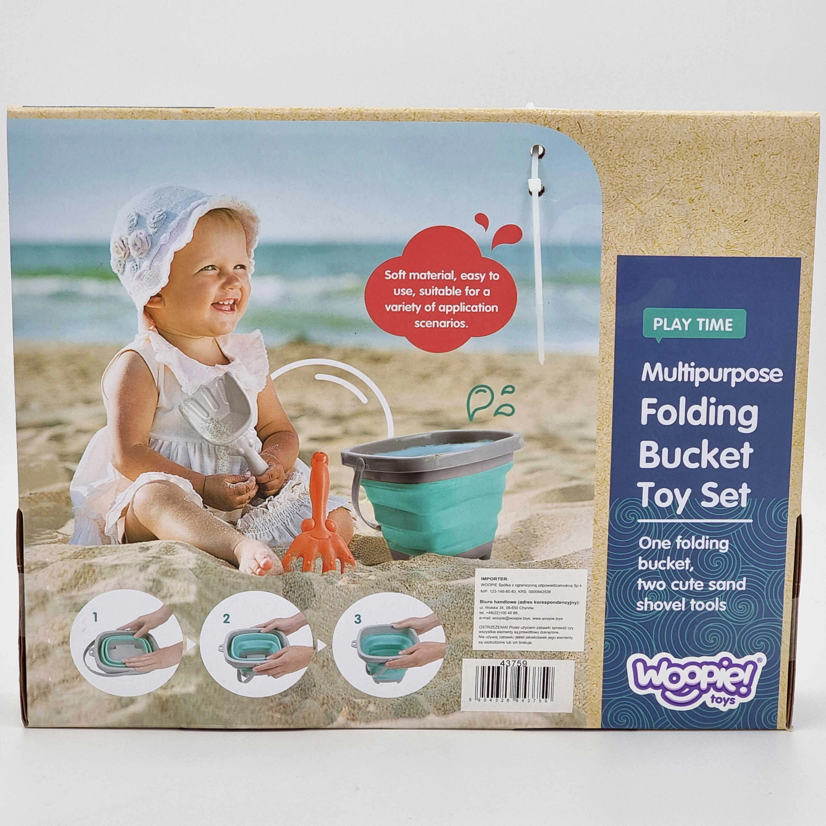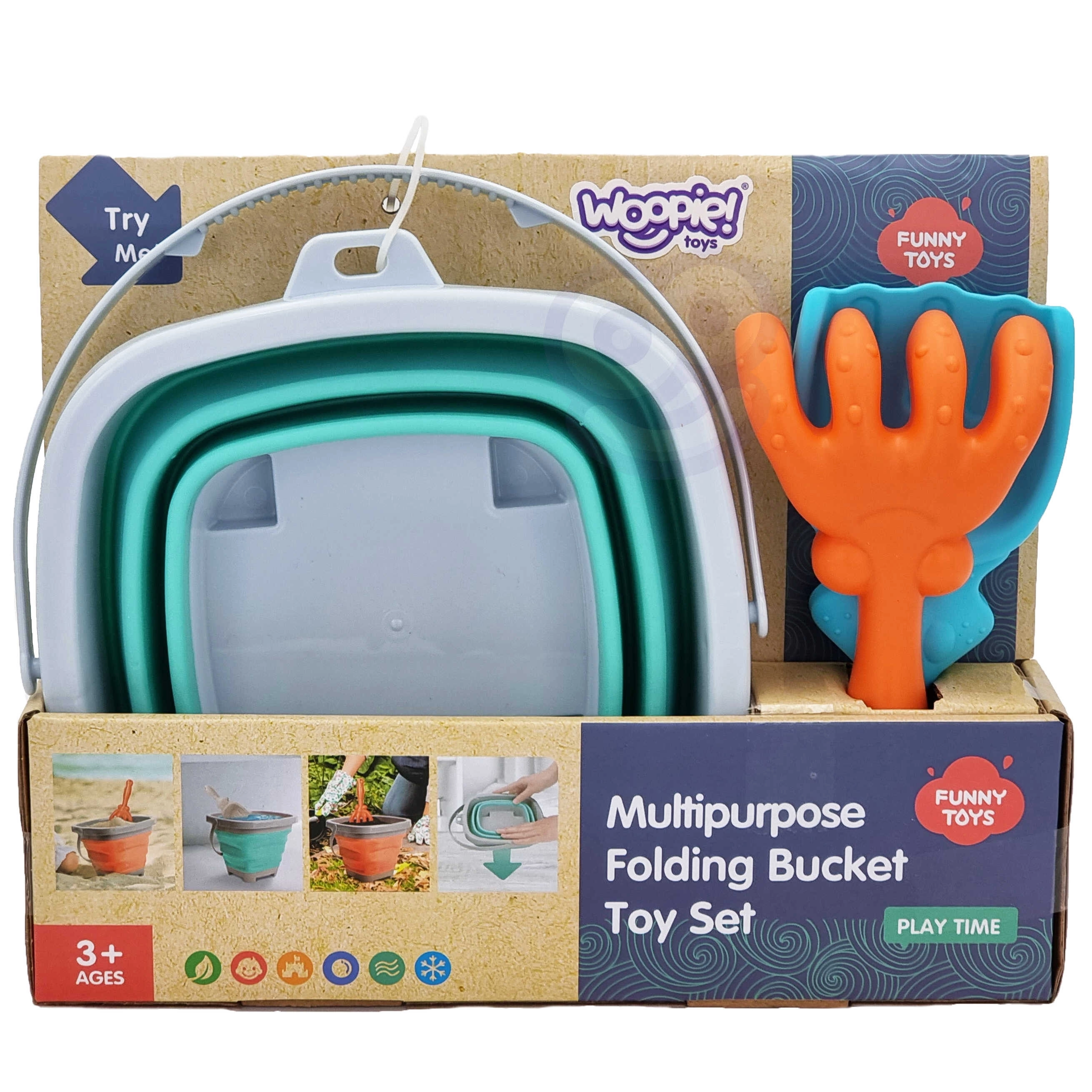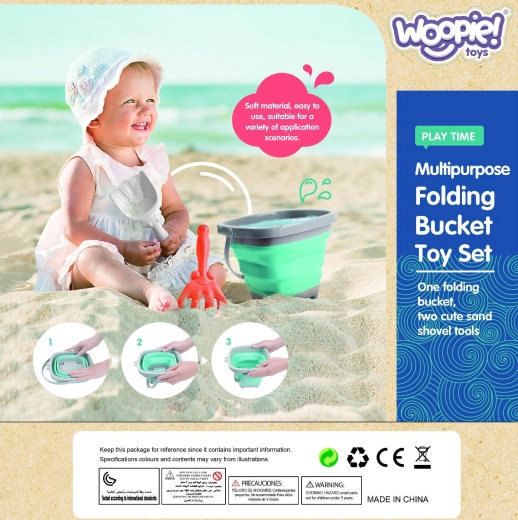 Il secchio pieghevole WOOPIE con accessori è un ottimo compagno per le vacanze e il gioco quotidiano. Le pareti in silicone piegate a fisarmonica permettono di ripiegare rapidamente il secchio in una forma piatta, così da entrare nello zainetto dei bambini, nel passeggino o nella borsa da spiaggia. Il set include anche una pratica paletta e un rastrello per costruire castelli e modellare la sabbia.