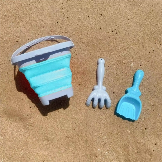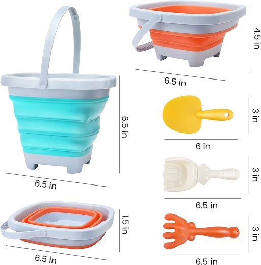 Set leggero e pratico per la sabbia per bambini dai 3 anni: secchio pieghevole in silicone da 5 l con paletta e rastrello. Grazie alla struttura a fisarmonica occupa pochissimo spazio, è facile da trasportare, ideale per la spiaggia, la sabbiera e il giardino e comodo da riporre. Il bordo, il fondo e il manico in plastica garantiscono stabilità, mentre le pareti in silicone assicurano resistenza e flessibilità.