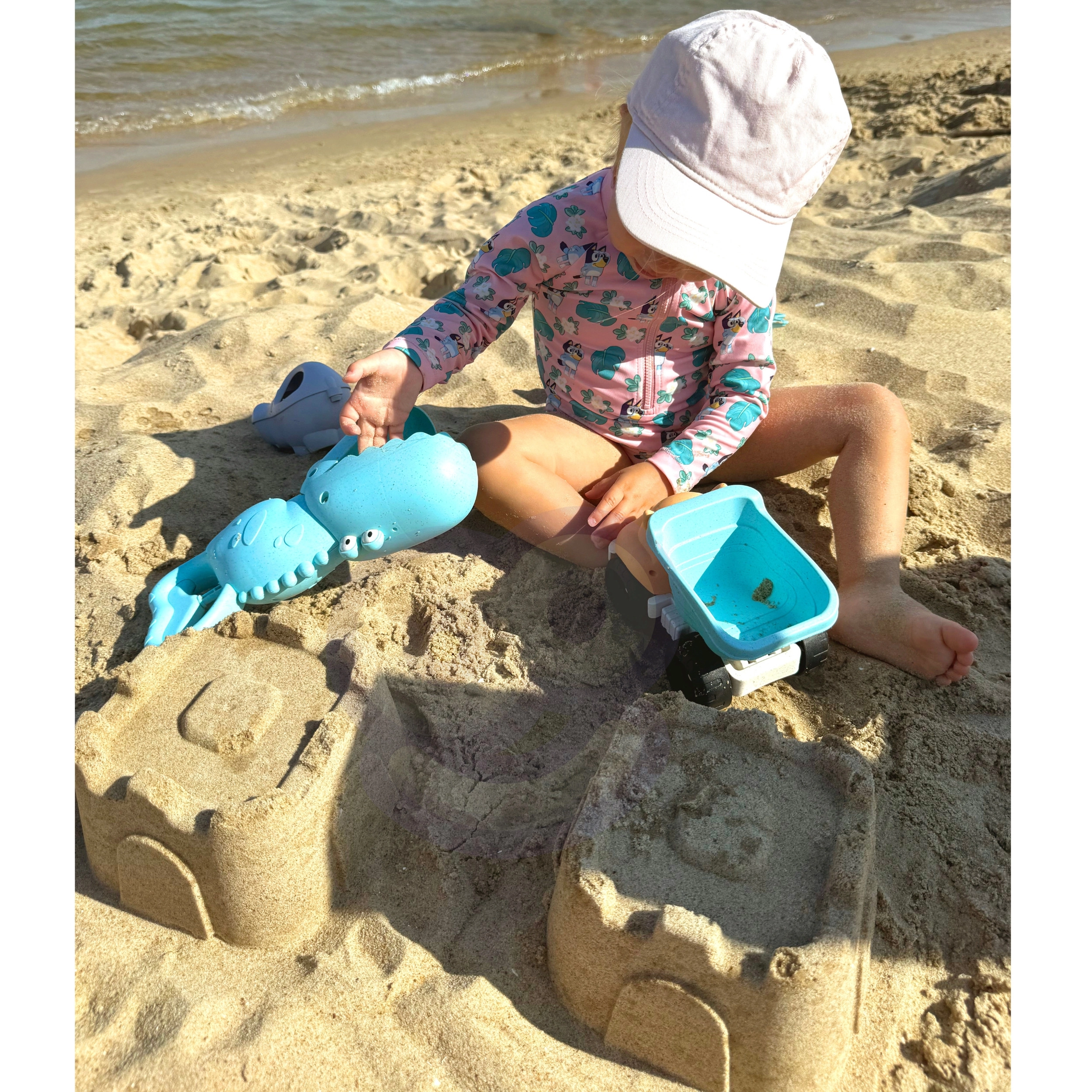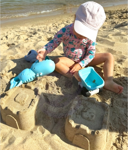 Il set favorisce lo sviluppo della motricità dei bambini, della coordinazione occhio–mano, della fantasia e del pensiero spaziale. Con il camioncino, la pinza a coccodrillo e le formine, i bambini costruiscono castelli, travasano la sabbia e trasportano carichi. Tutti i pezzi sono leggeri, con forme di animaletti amate e profili amichevoli per un gioco sicuro.