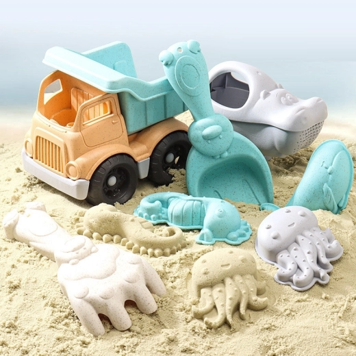 Il pratico camion con cassone ribaltabile, il dolce annaffiatoio a forma di ippopotamo, la paletta, il rastrello e le tre formine marine garantiscono ore di divertimento tra costruzioni, trasporto e creazioni. Il gioco con il set sviluppa la motricità fine e grossa, la coordinazione occhio–mano, il pensiero spaziale e le competenze sociali.
