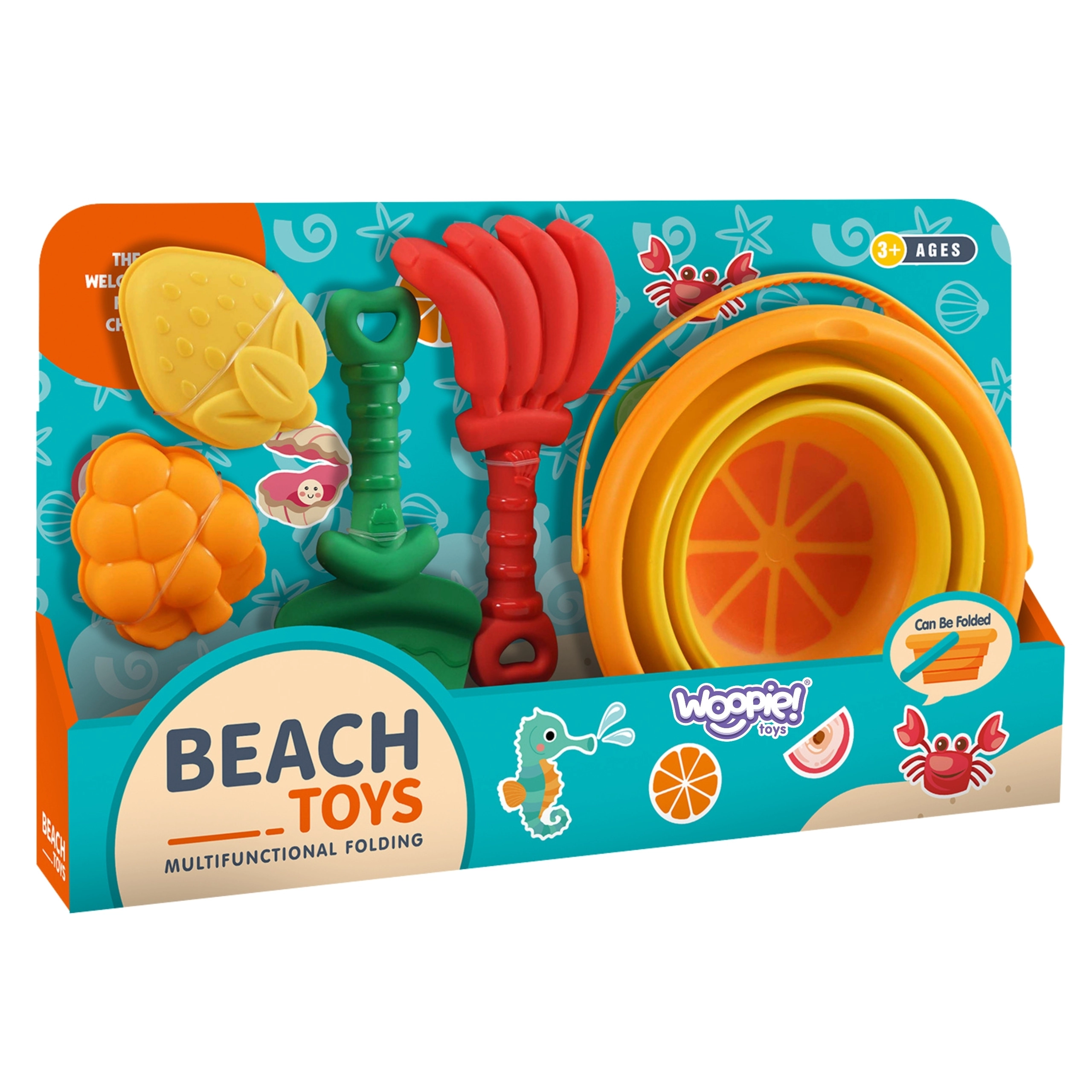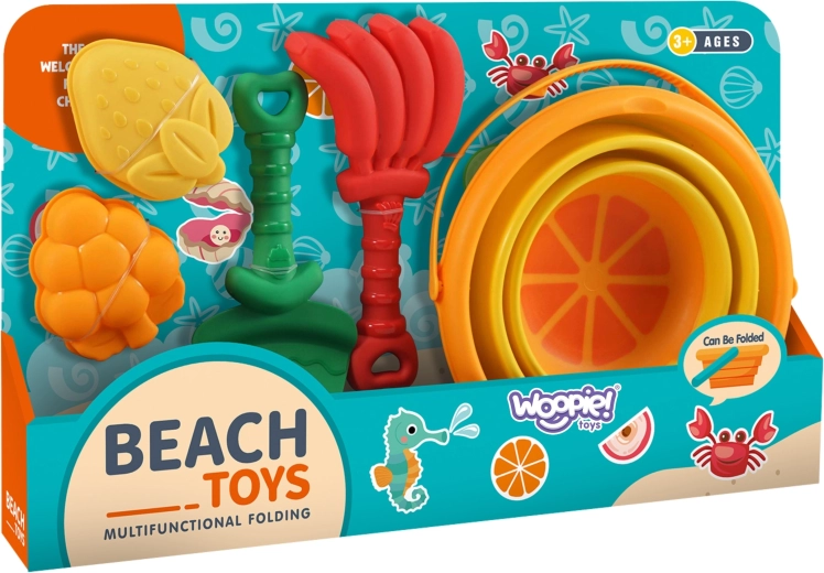 Il colorato set da spiaggia per la sabbia con motivo frutta tropicale del marchio WOOPIE è ideale per i bambini sia per la sabbiera che per la spiaggia. Offre un design compatto, plastica resistente e sicura e forme divertenti di attrezzi e formine che favoriscono creatività e motricità fine.