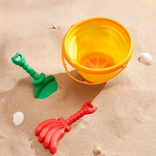 Questo set versatile per la sabbia unisce praticità e un divertente tema tropicale. Il secchiello pieghevole fa risparmiare spazio nello zaino o nel passeggino e gli attrezzi leggeri sono facili da impugnare per i bambini. Grazie al materiale robusto e sicuro, il set è un'ottima scelta per il gioco quotidiano in spiaggia e nella sabbiera.