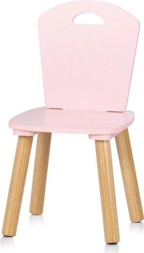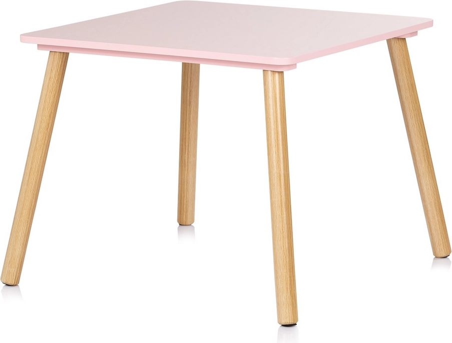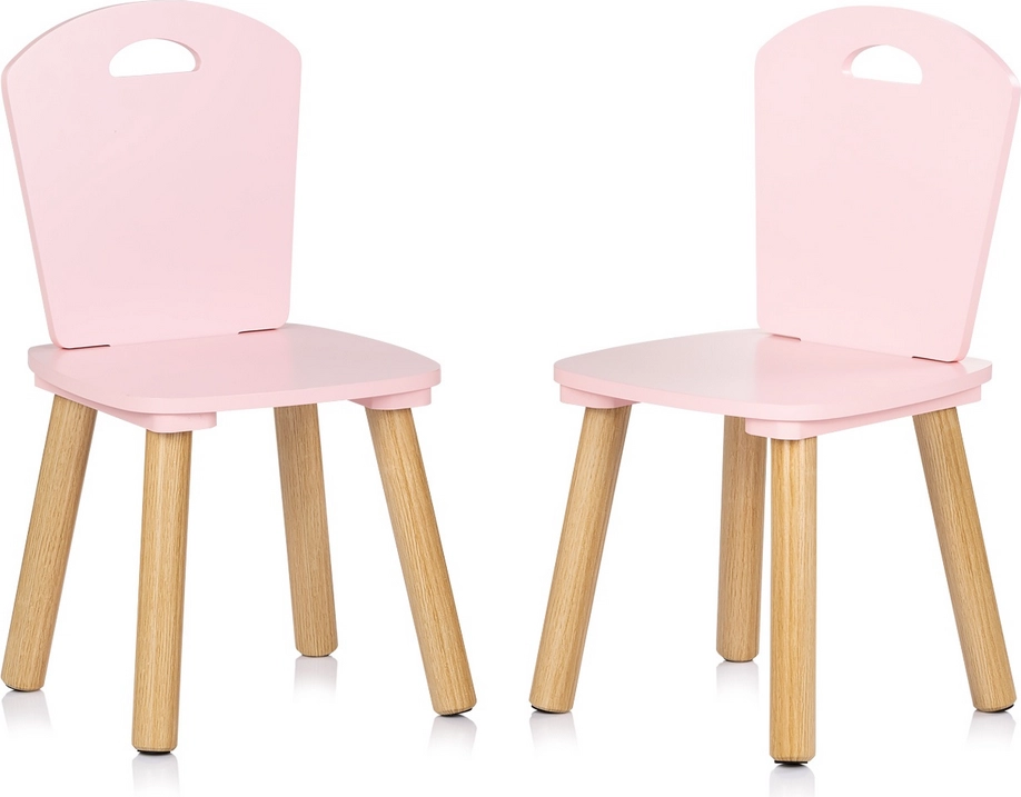 Set elegante e sicuro per la cameretta: tavolo per bambini e due sedie in delicato rosa con gambe in legno naturale. Bordi arrotondati per massima sicurezza, struttura solida in MDF di qualità e dimensioni ergonomiche per giocare, creare e i primi momenti di apprendimento in totale comfort.