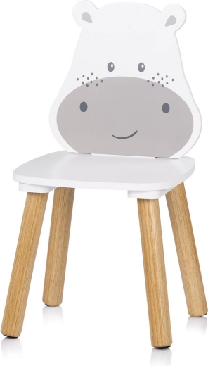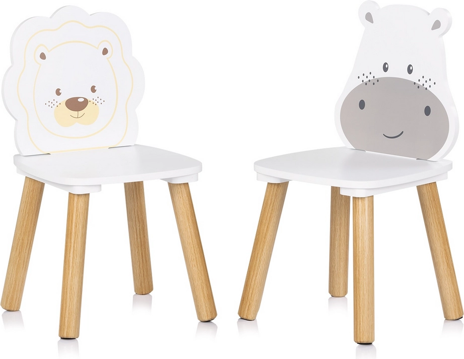 Due sedie con simpatici schienali a tema animale — ippopotamo e leoncino — stimolano la fantasia e rendono lo studio e il gioco divertenti.