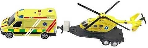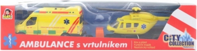 Set di salvataggio comprendente un'ambulanza e un elicottero, realizzato in metallo e plastica, appartenente alla linea City Collection con design ceco. L'ambulanza è dotata di un rimorchio con un elicottero di salvataggio, ideale per interventi rapidi ovunque. Un giocattolo fantastico per piccoli soccorritori. L'ambulanza è dotata di faro funzionante (luce e suono). Aspetto realistico, materiale in combinazione di metallo e plastica. Movimento a retrocarica. Alimentazione: batterie 2 x LR41.