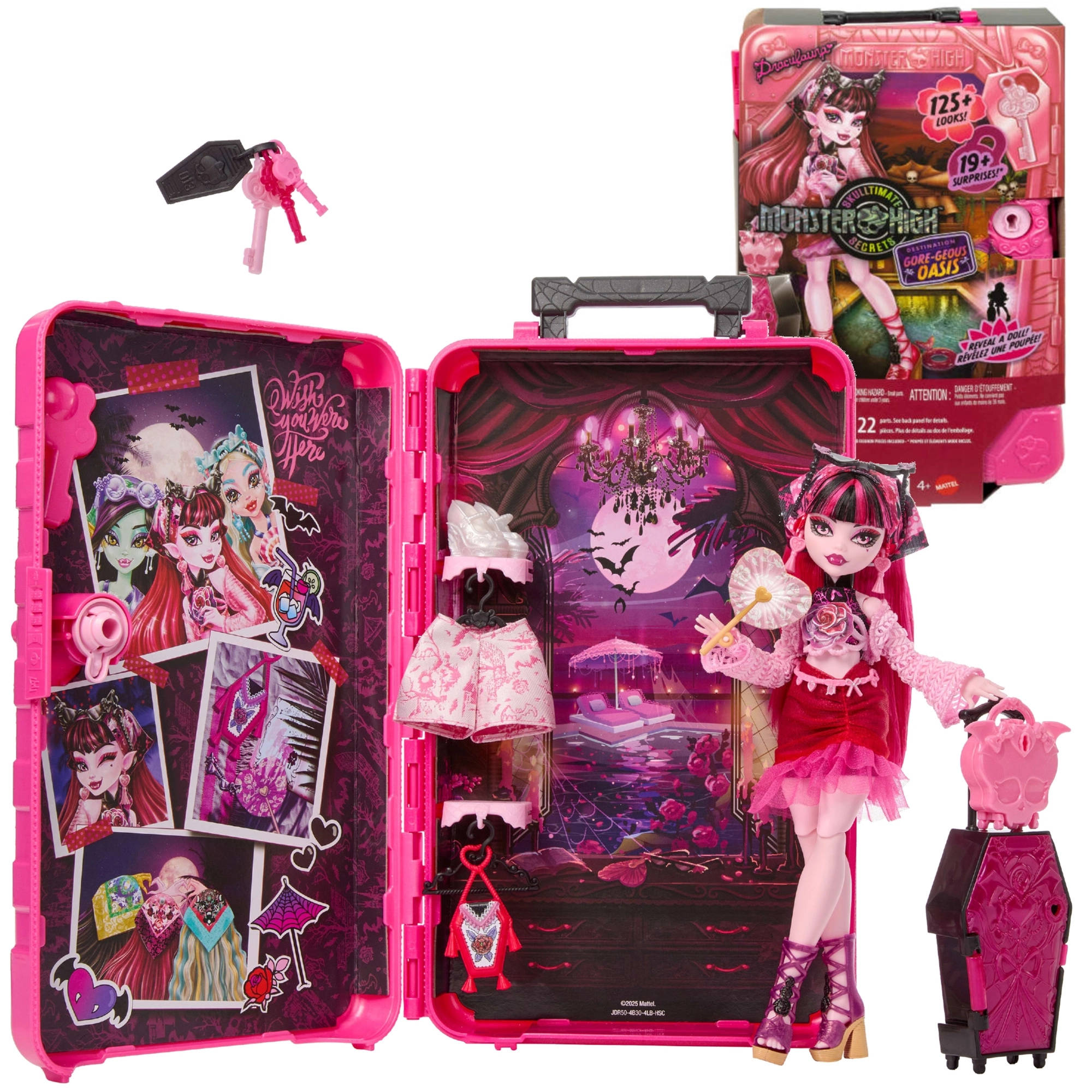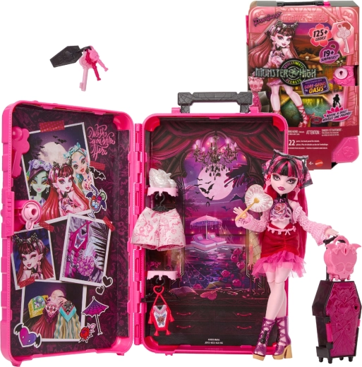 La bambola Draculaura della serie Monster High Secret Creepers invita i bambini nel mondo della moda vampiresca e dei viaggi. Il grande trolley rosa e nero con ruote si apre e all’interno nasconde appendini, ripiani e spazio per riporre vestiti e accessori. Cerca le tre chiavi, apri i comparti e scopri nuovi pezzi – dagli occhiali e la bandana fino al ventaglio e alle scarpe.