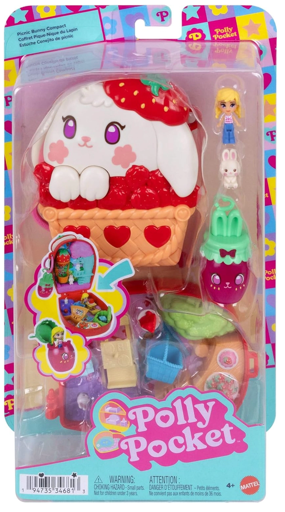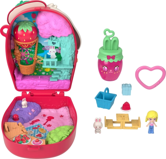 Inclusi una micro bambolina POLLY, una figurina di coniglietto e numerosi accessori per organizzare il picnic. Il design compatto con clip a moschettone permette di fissare il set a zaini o borse, così i bambini possono portarlo ovunque. Il ciondolo-scrigno in dotazione conserva al sicuro le figurine durante gli spostamenti.