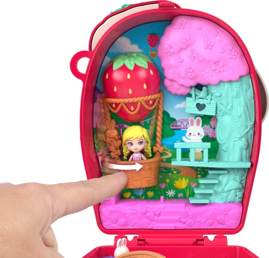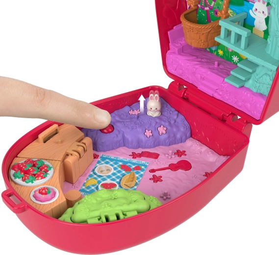 Questo delizioso compatto ha la forma di un coniglietto raggomitolato in un cestino di fragole. Una volta aperto, si trasforma in una dettagliata scena di picnic e giardino con tavolino pieghevole, palloncino alla fragola “volante” e un cespuglio segreto per nascondere i piccoli oggetti. I bambini ameranno gli elementi ribaltabili e scorrevoli che danno vita alle storie e stimolano la fantasia.