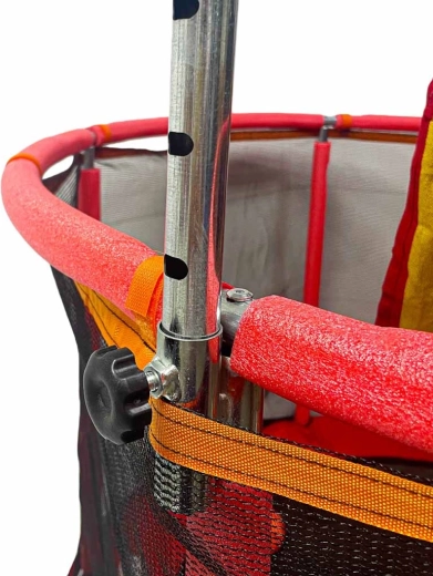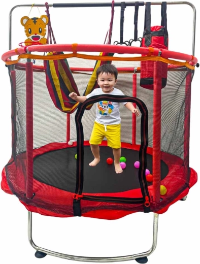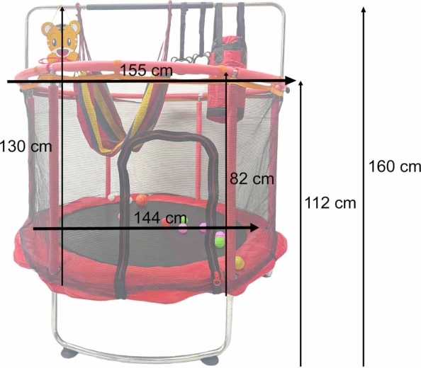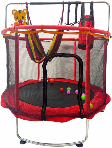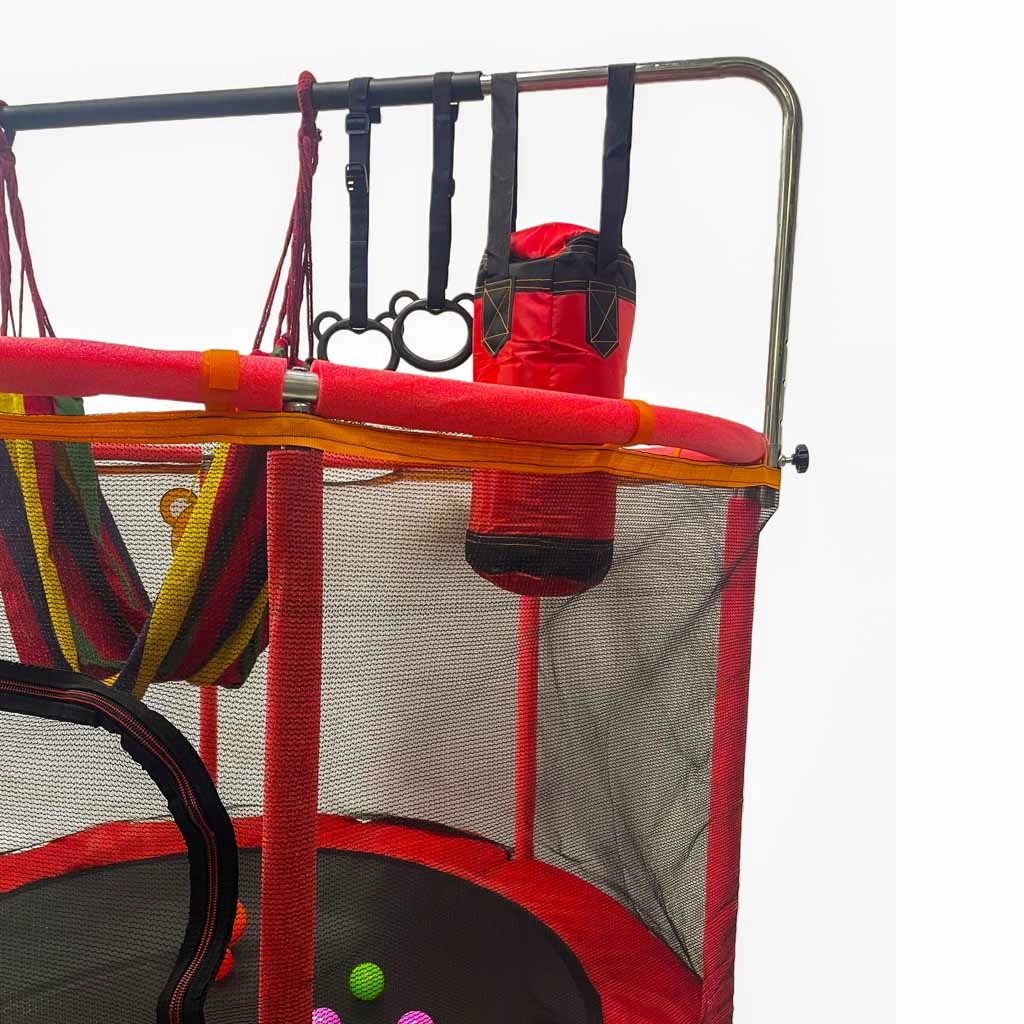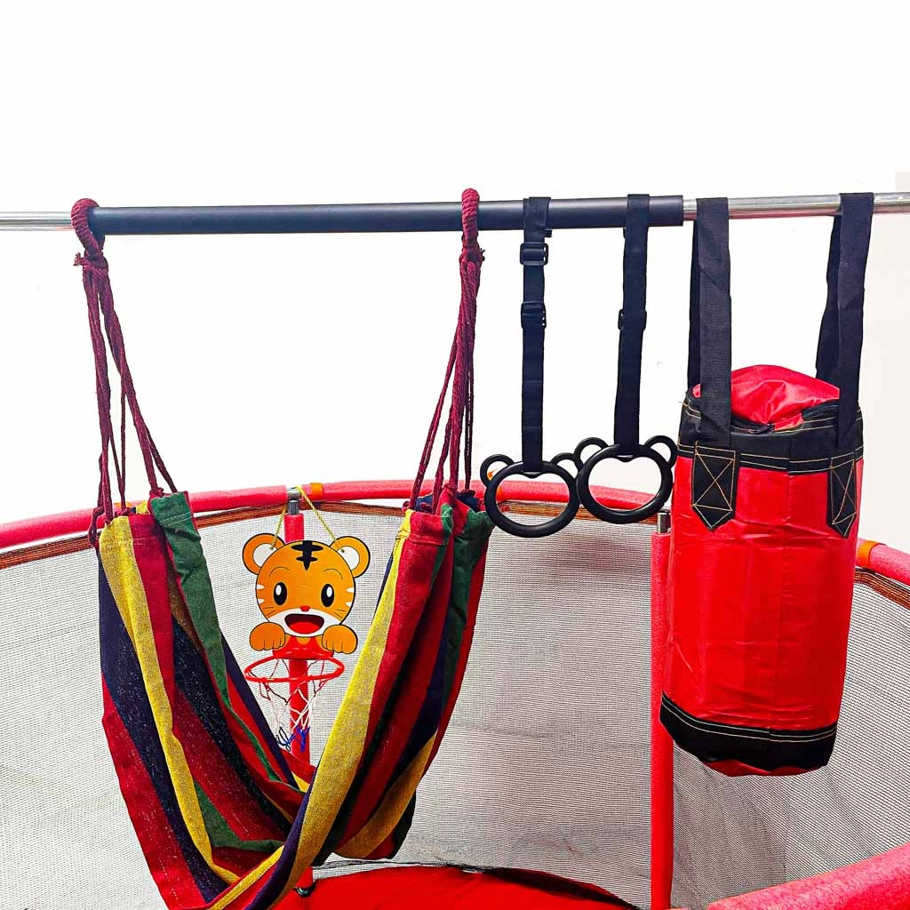 - tabellone da basket con pallina e pompetta; 12 palline colorate; amaca con borsa portaoggetti; due impugnature da allenamento con cinghie; sacco da boxe multifunzione (senza riempimento) + guanti; kit di montaggio completo (telaio, schiuma, rete, tappeto elastico, molle)