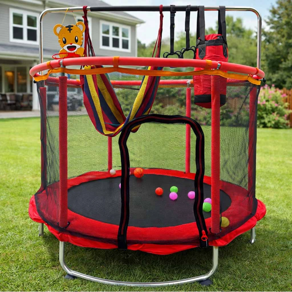Regala ai bambini movimento gioioso e sicurezza con questo trampolino da giardino per bambini da 150 cm. Struttura stabile, rete di sicurezza protettiva e ricco set di accessori, inclusi canestro da basket, amaca a seduta e sacco da boxe, trasformano ogni giorno in divertimento attivo. Elevata portata fino a 150 kg e dettagli studiati per comfort e sicurezza, in casa e in giardino.