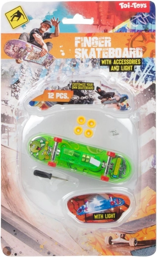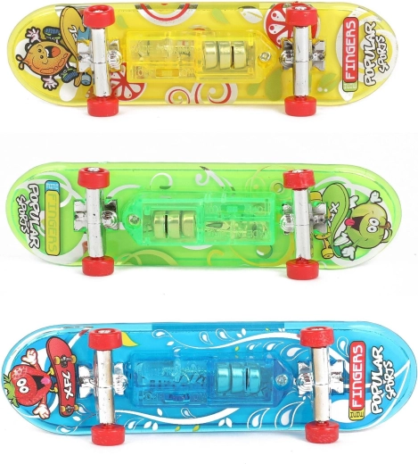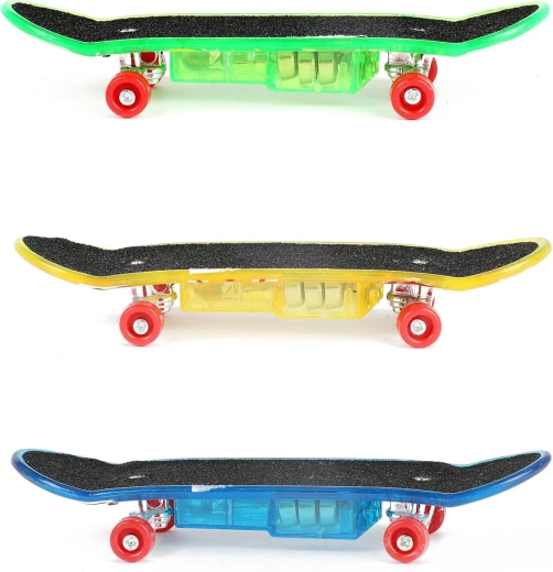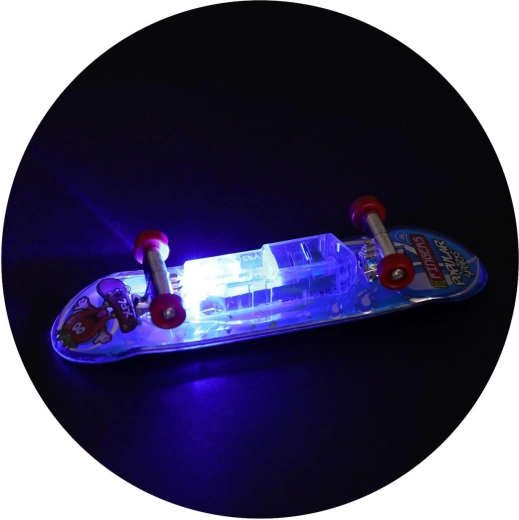 Divertente skateboard da dito lungo 9,5 cm con alimentazione a batterie e illuminazione LED integrata per corse ed effetti spettacolari anche nei trick. Dimensioni compatte, struttura resistente ed effetti luminosi che piaceranno ai bambini e ai principianti del fingerboarding. Disponibile in 3 colori vivaci con telaio trasparente, truck in metallo e ruote a scorrimento fluido.